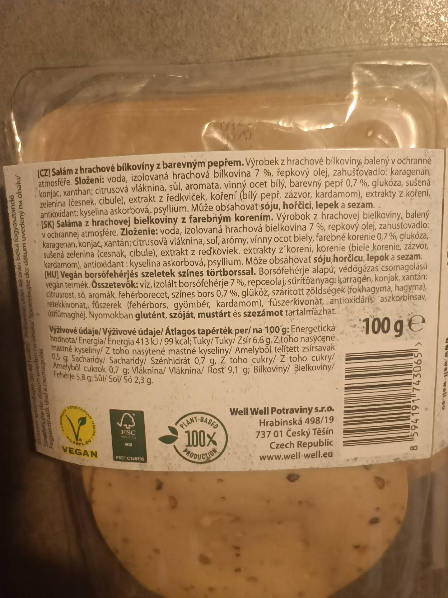 Salám z hrachové bílkoviny s barevným pepřem