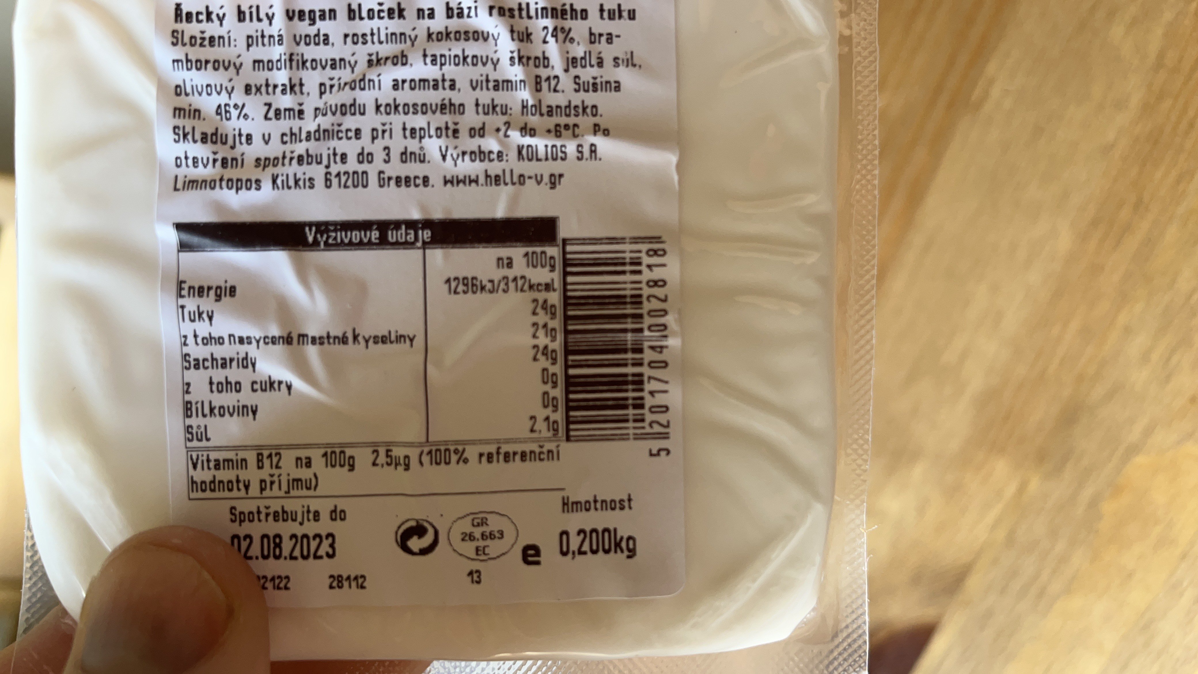 Řecký bílý vegan bloček na bázi rostlinného tuku.