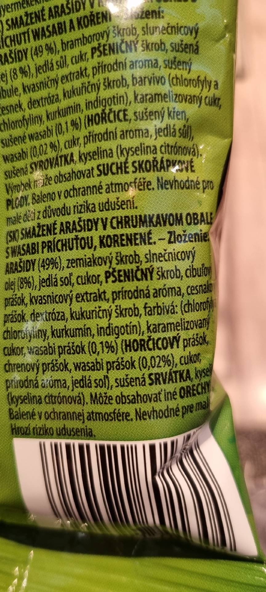 Smažené arašídy v křupavém obale s wasabi příchutí, kořeněné.