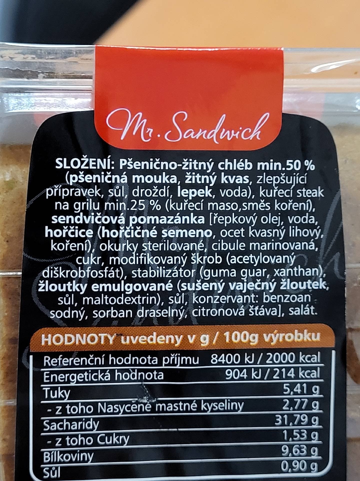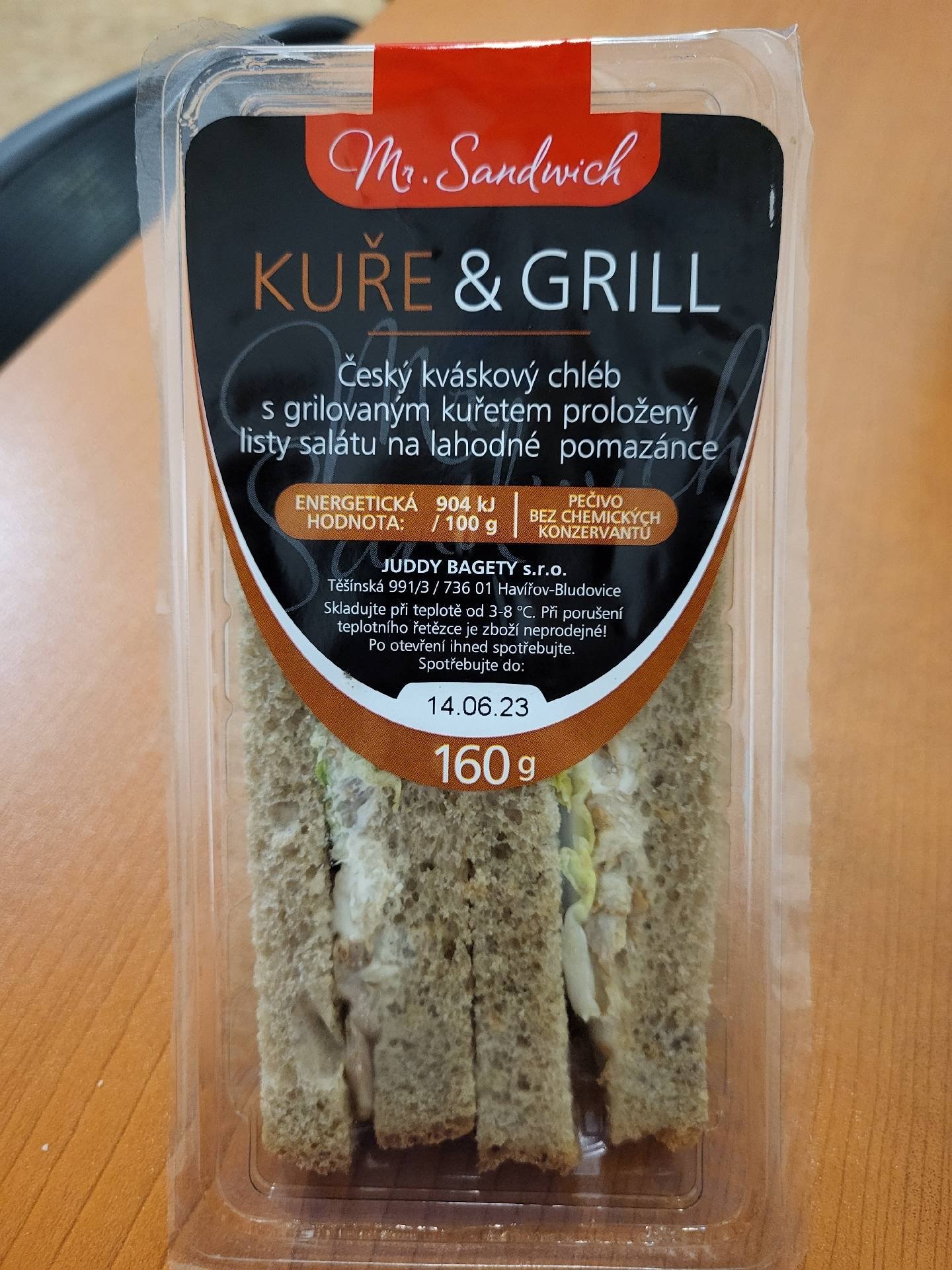 Český kváskový chléb s grilovaným kuřetem proložený listy salátu na lahodné pomazánce.