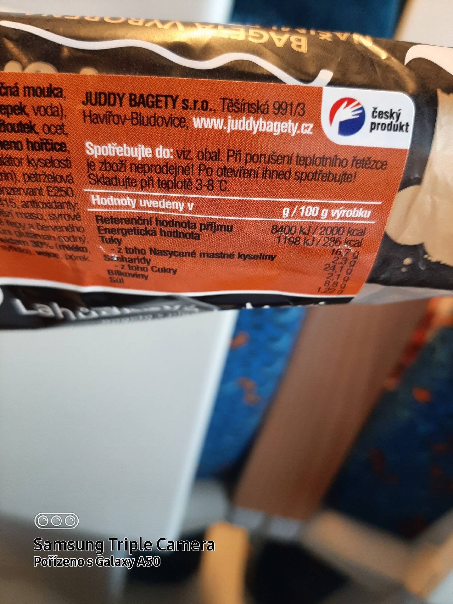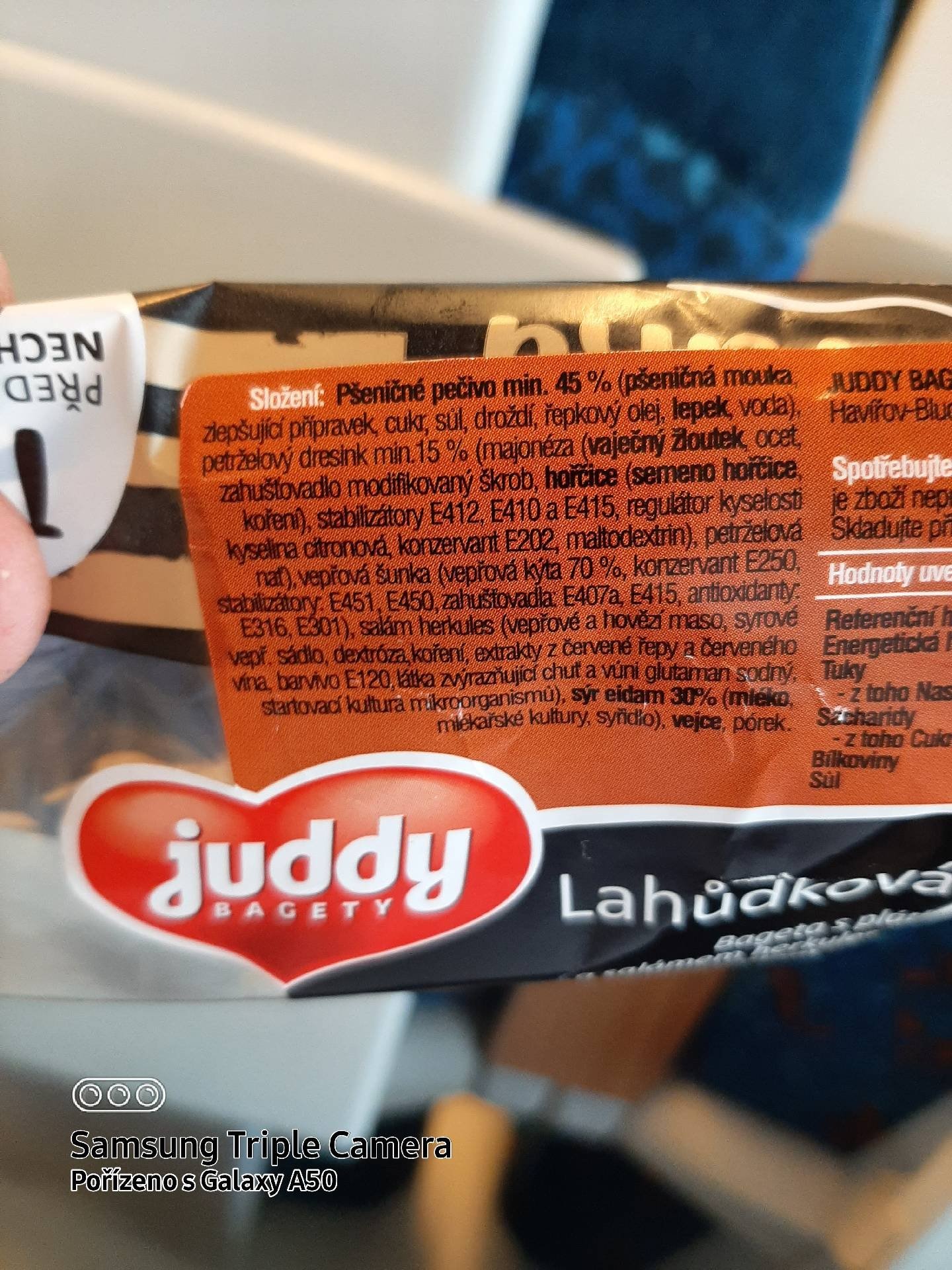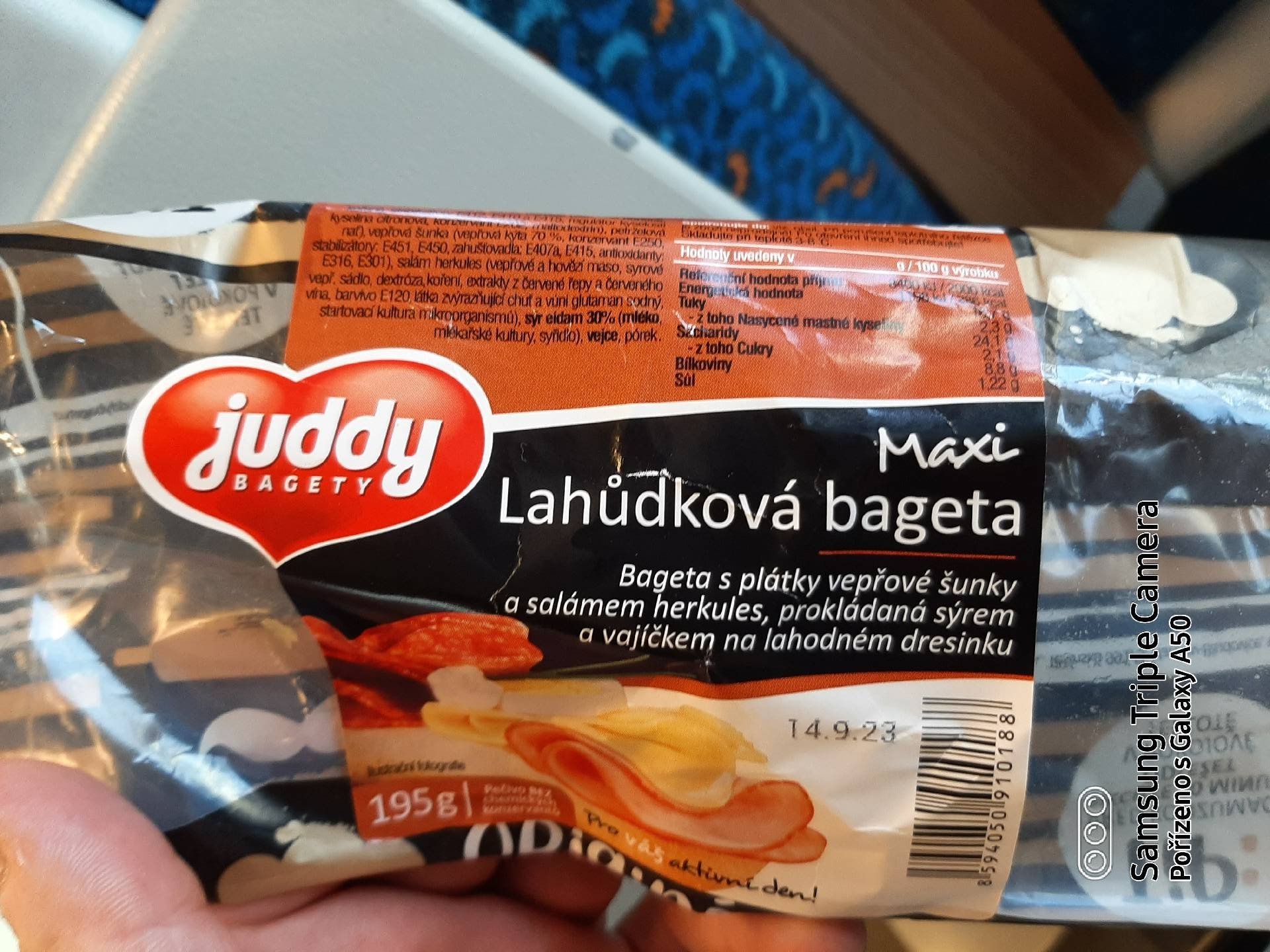Bageta s plátky vepřové šunky a salámem herkules, prokládaná sýrem a vajíčkem na lahodném dresinku.