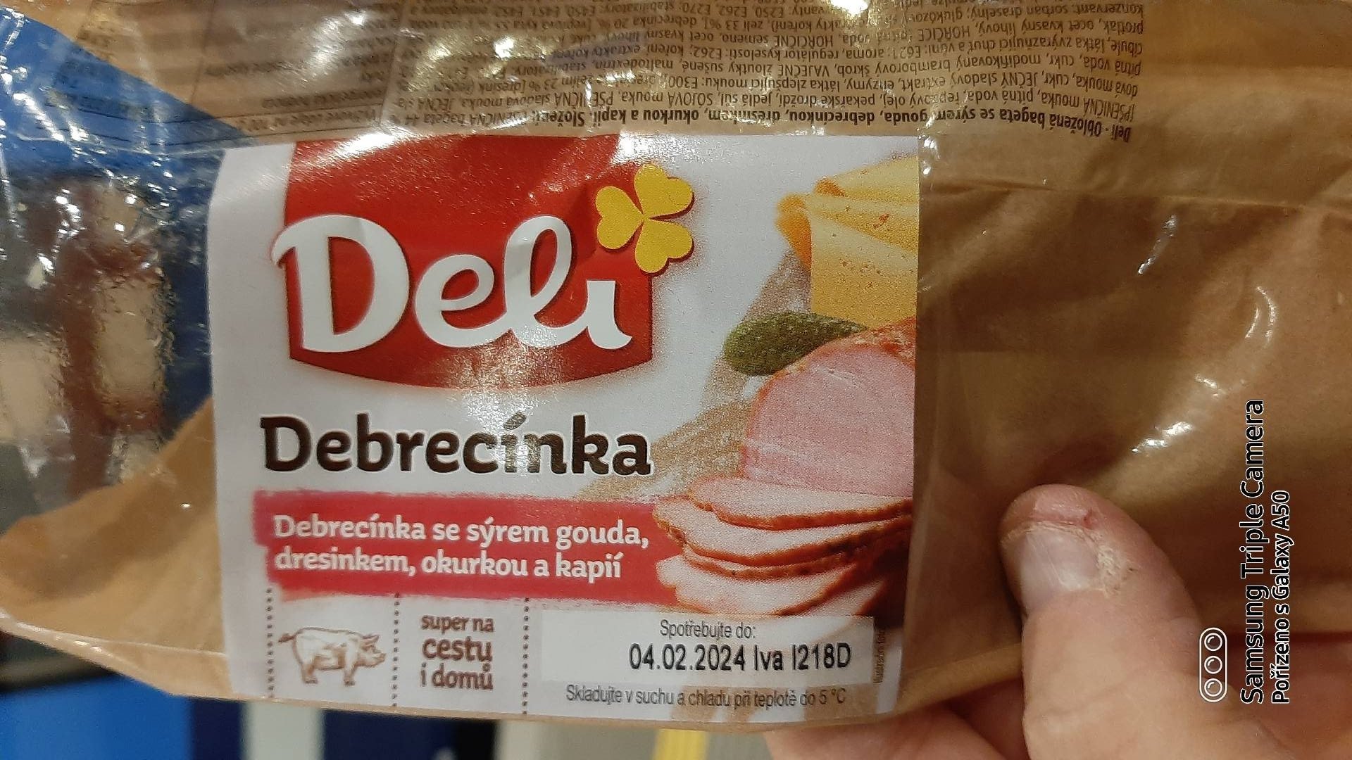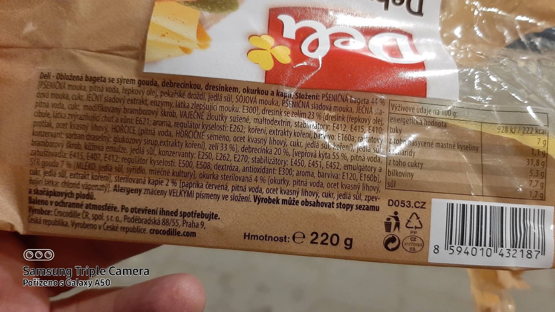 Obložená bageta se sýrem gouda, debrecínkou, dresinkem, okurkou a kapii.