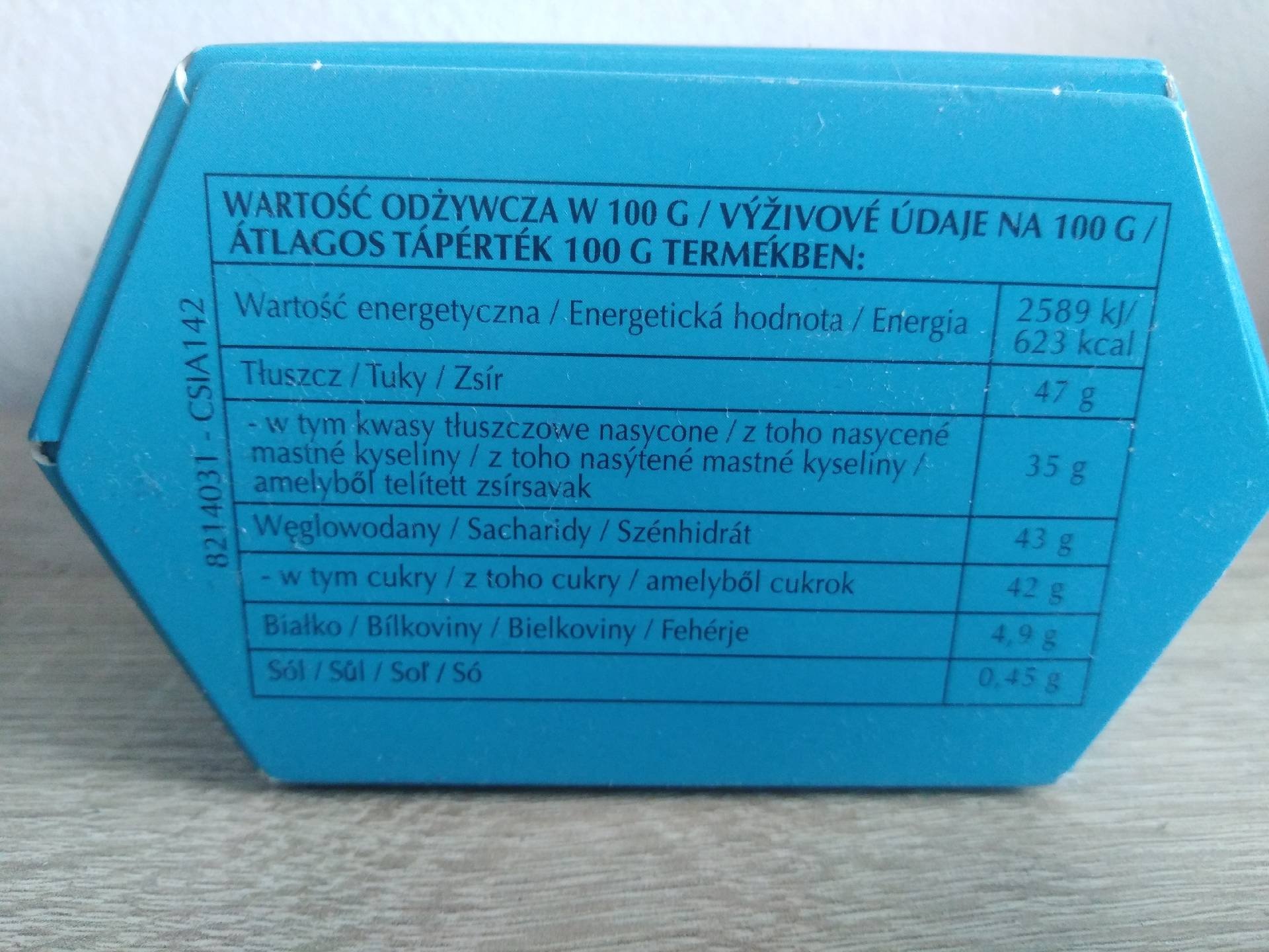 Obsah kakaové sušiny min. 32%. Obsah mléčné sušiny min. 21%.