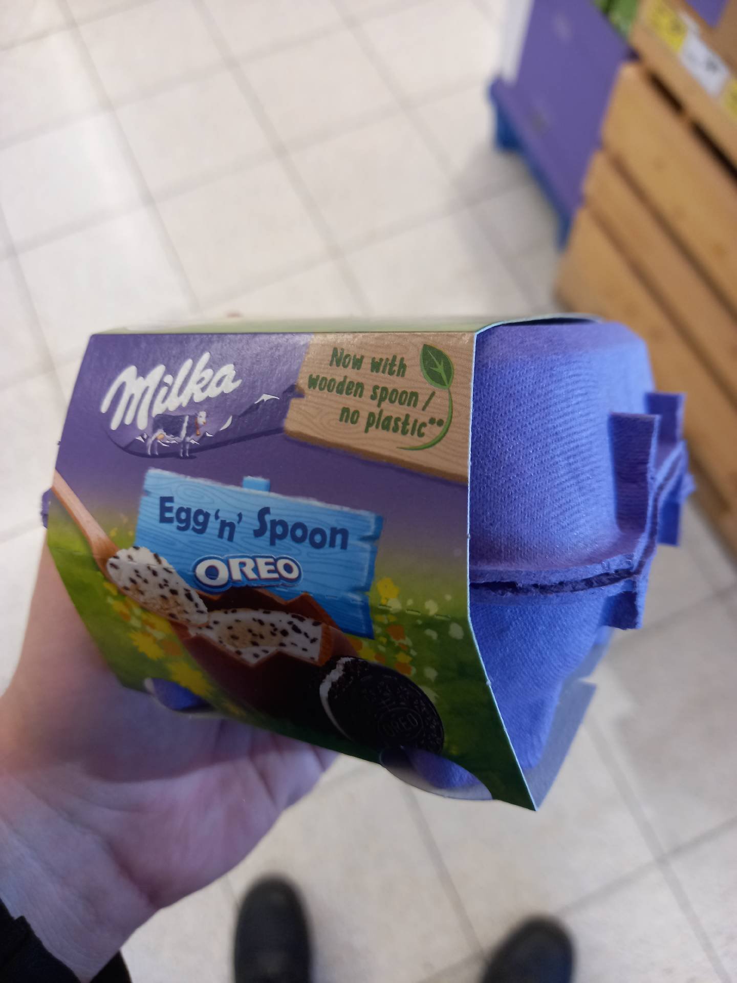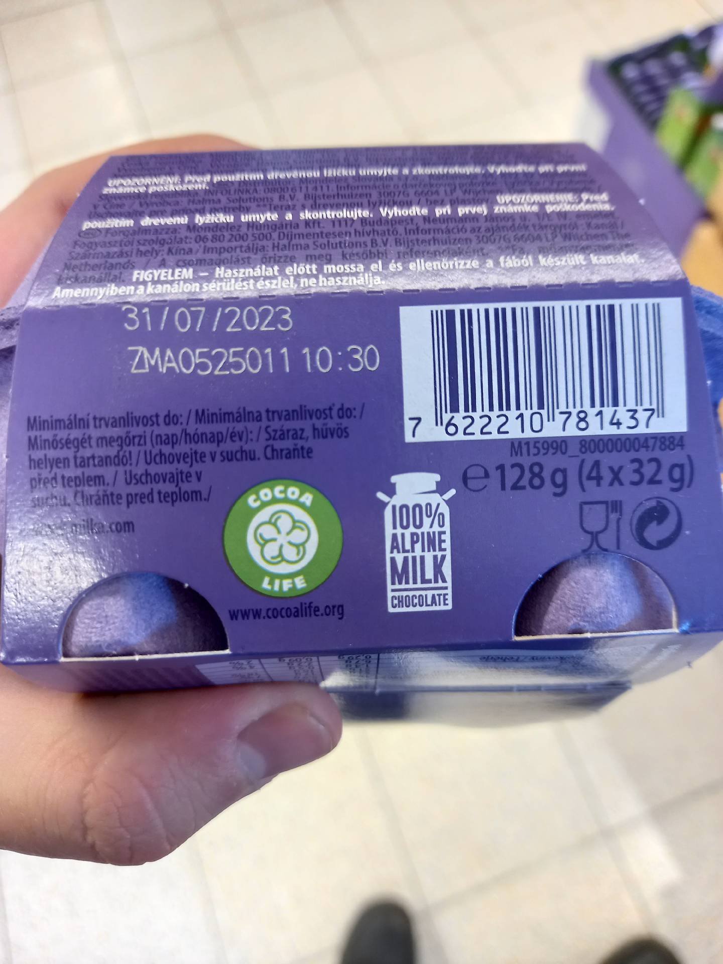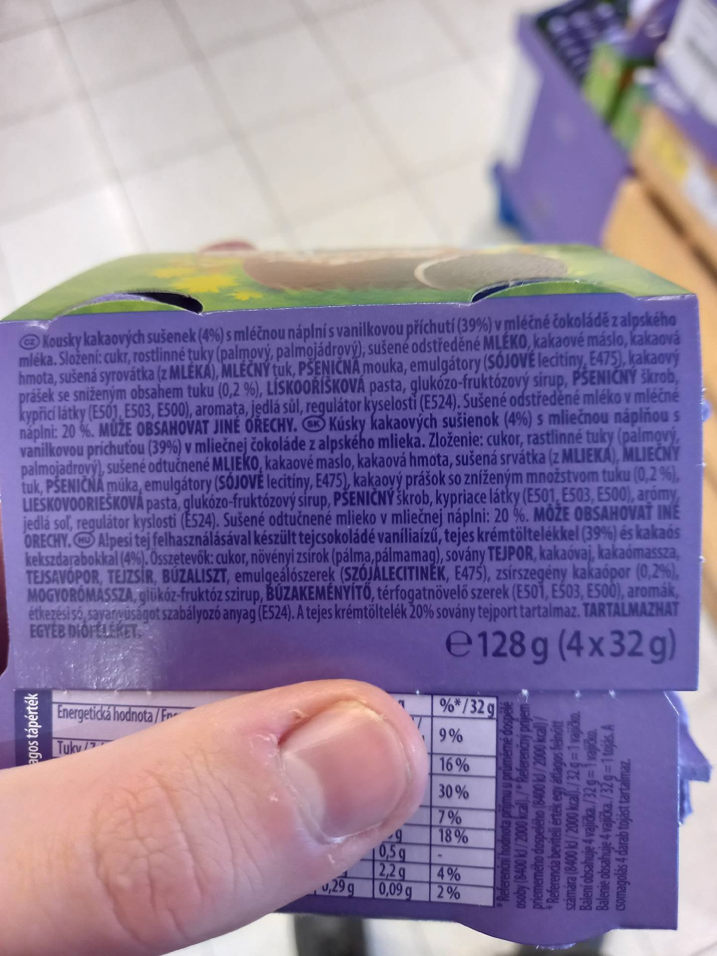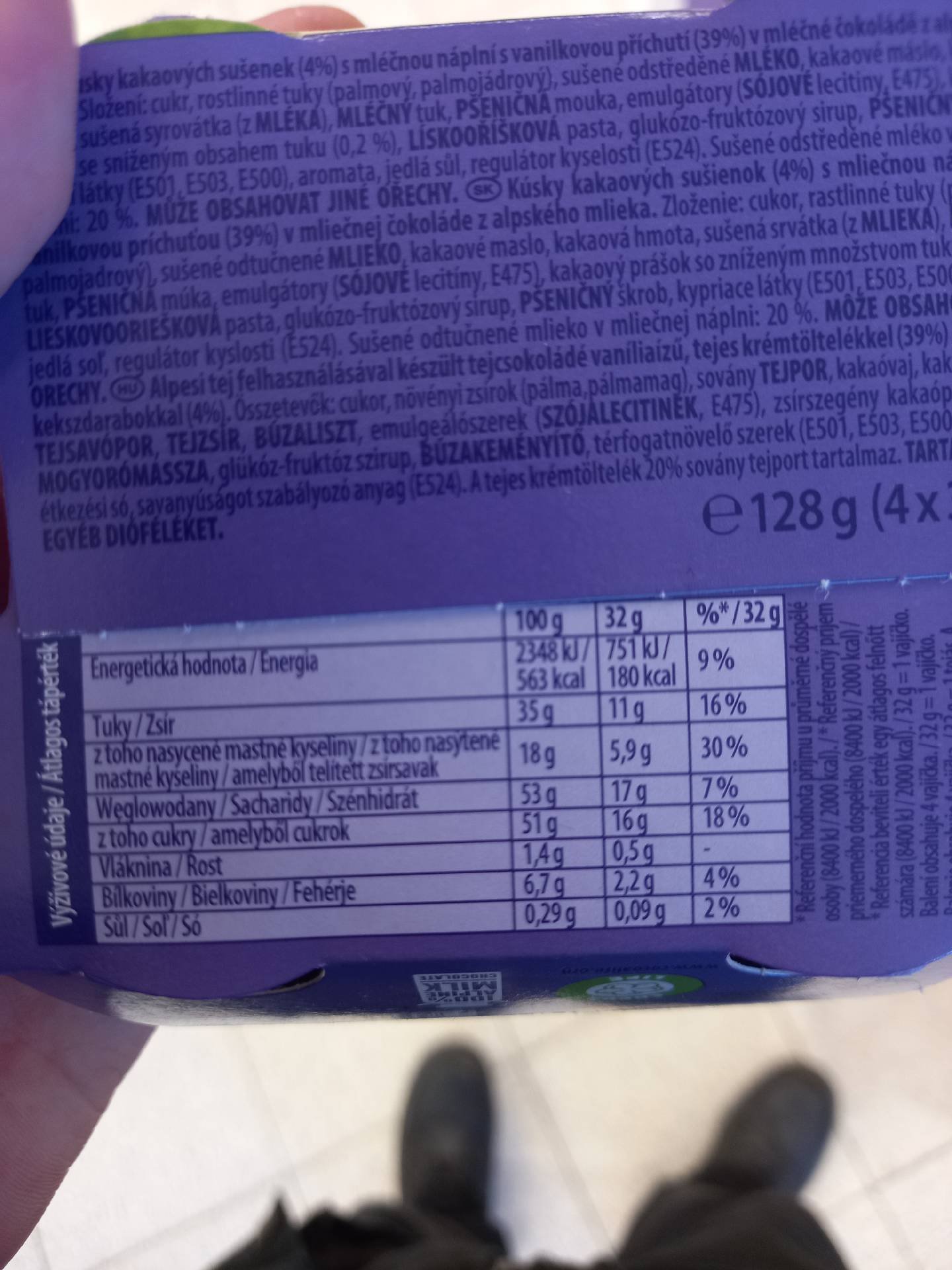 Kousky kakaových sušenek (4%) s mléčnou náplní s vanilkovou příchutí (39%) s mléčné čokoládě z alpského mléka.