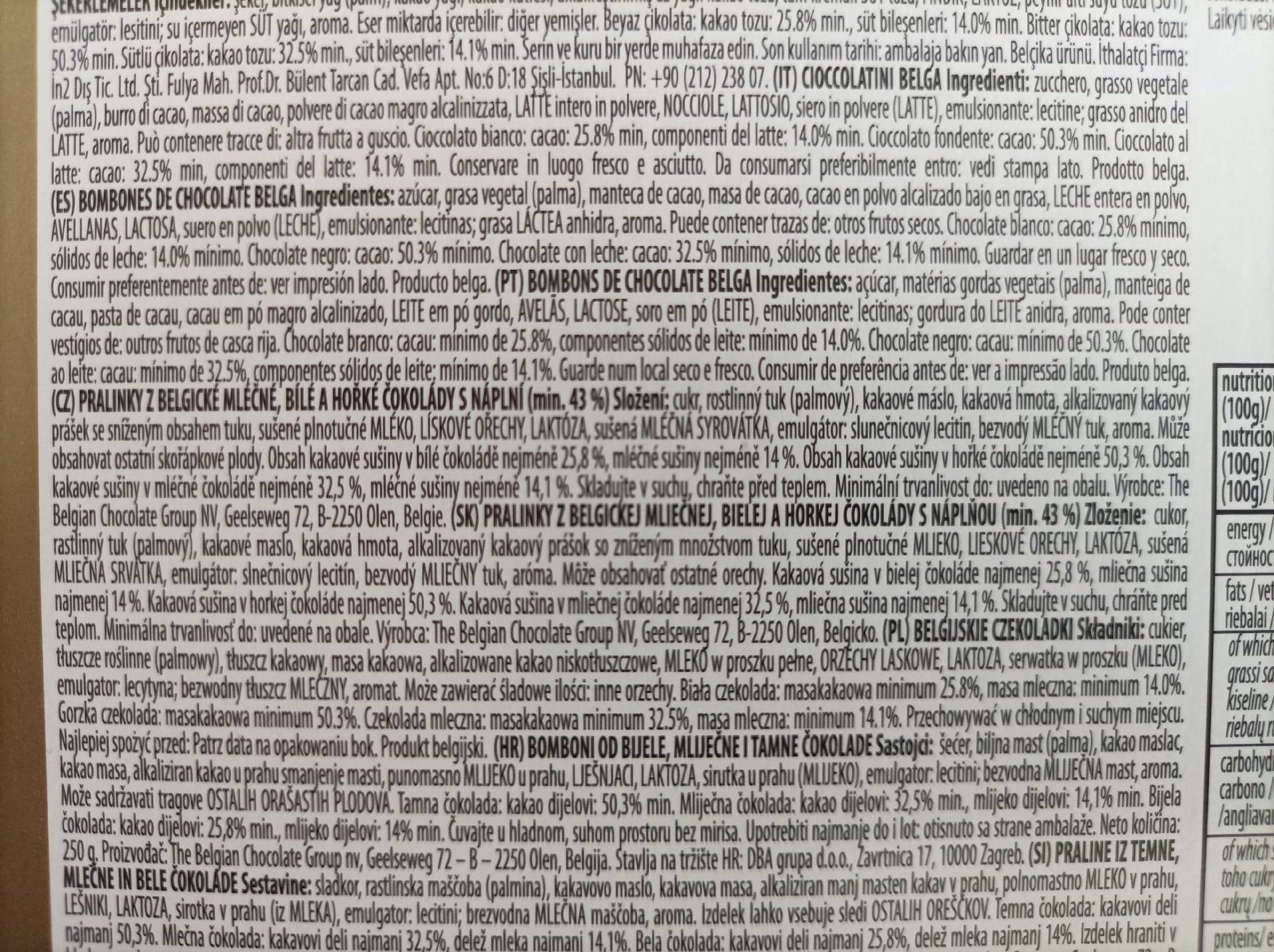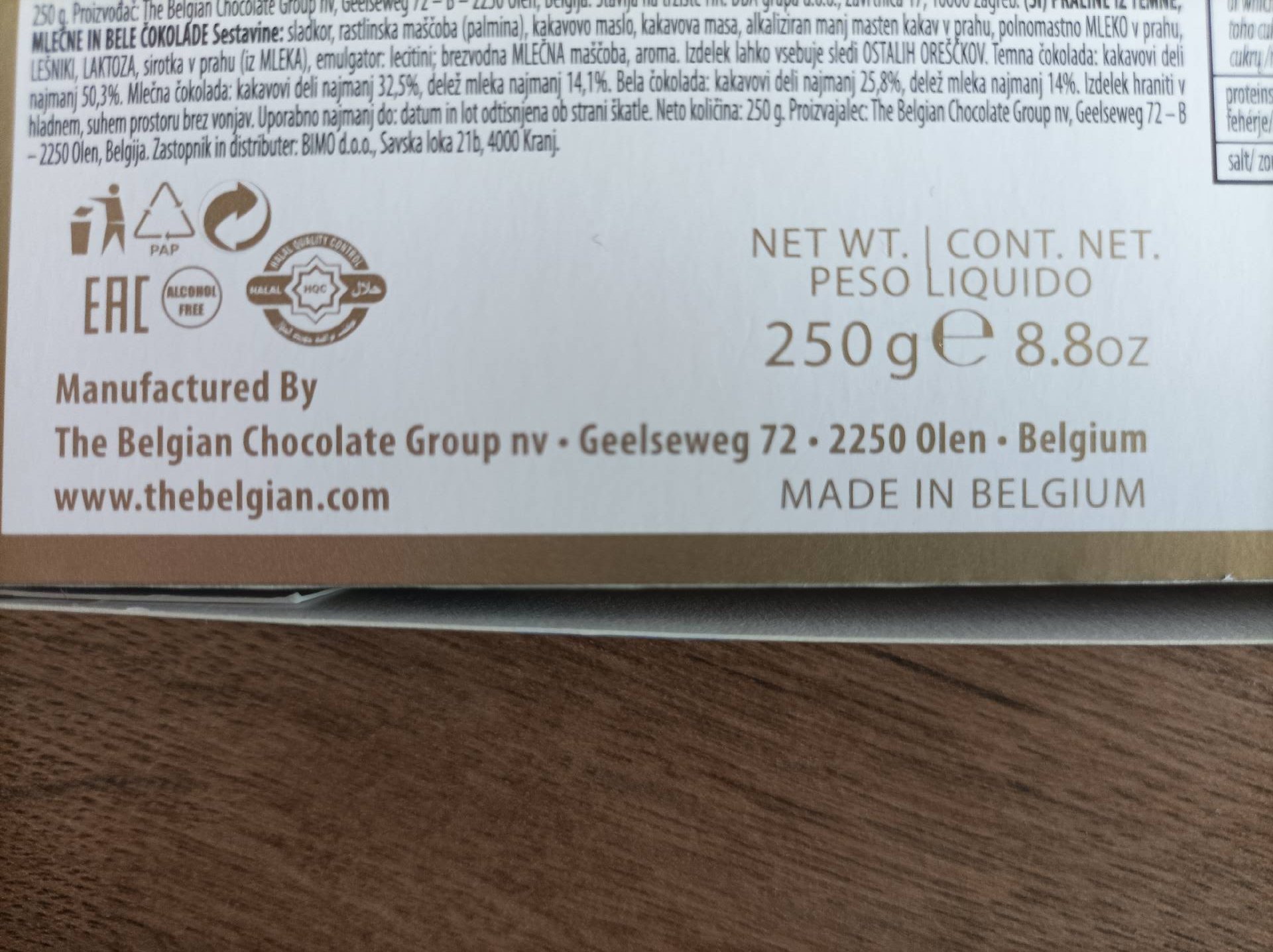 Pralinky z belgické mléčné, bílé a hořké čokolády s náplní min. 43%.