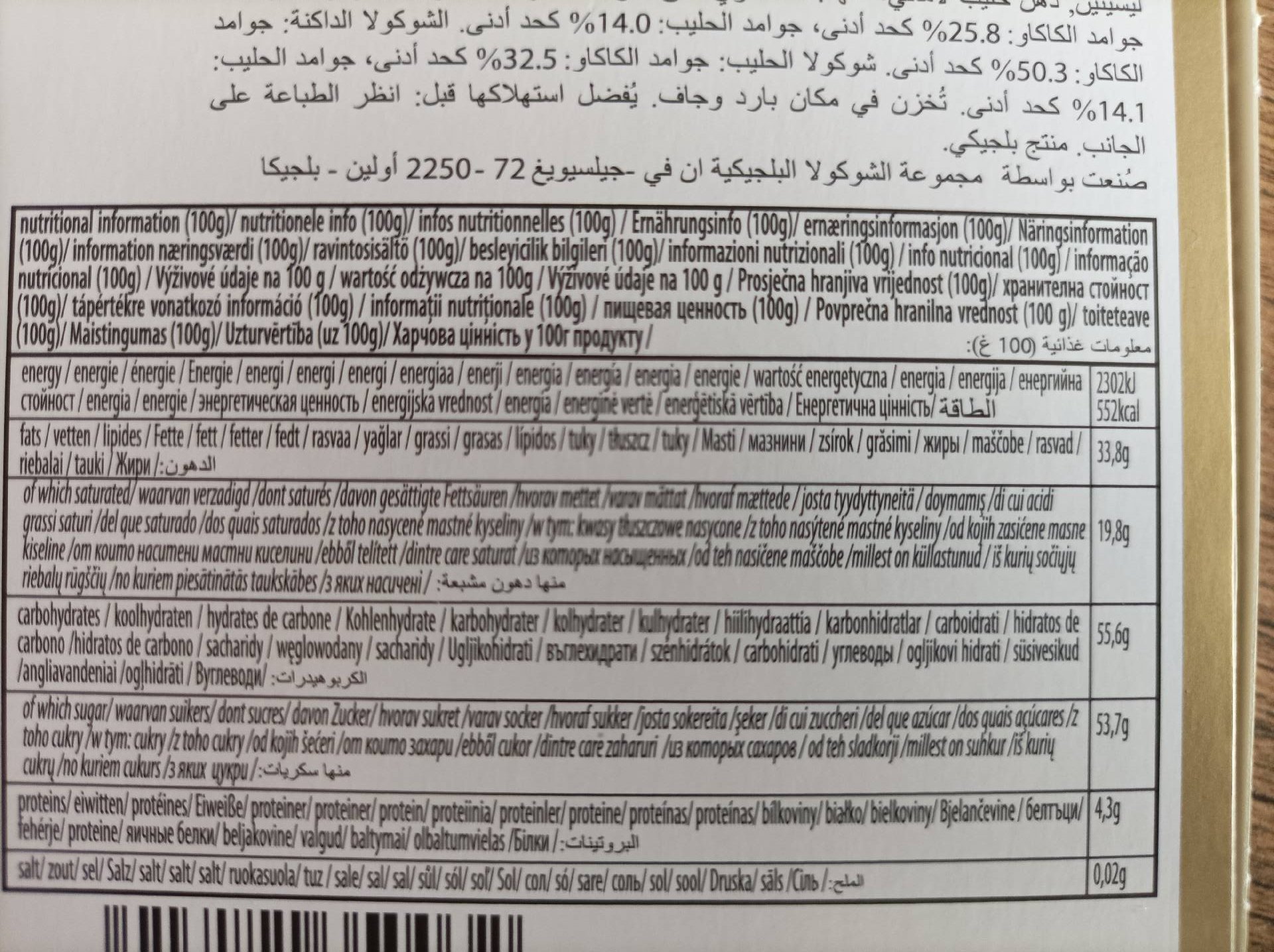 obsah kakaové sušiny v bílé čokoládě min. 25,8%, mléčné sušiny min. 14%.