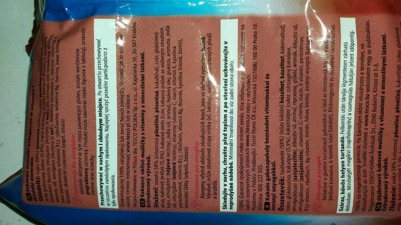 Kakaové obilné mušličky s vitamíny a minerálními látkami. Extrudovaný výrobek.