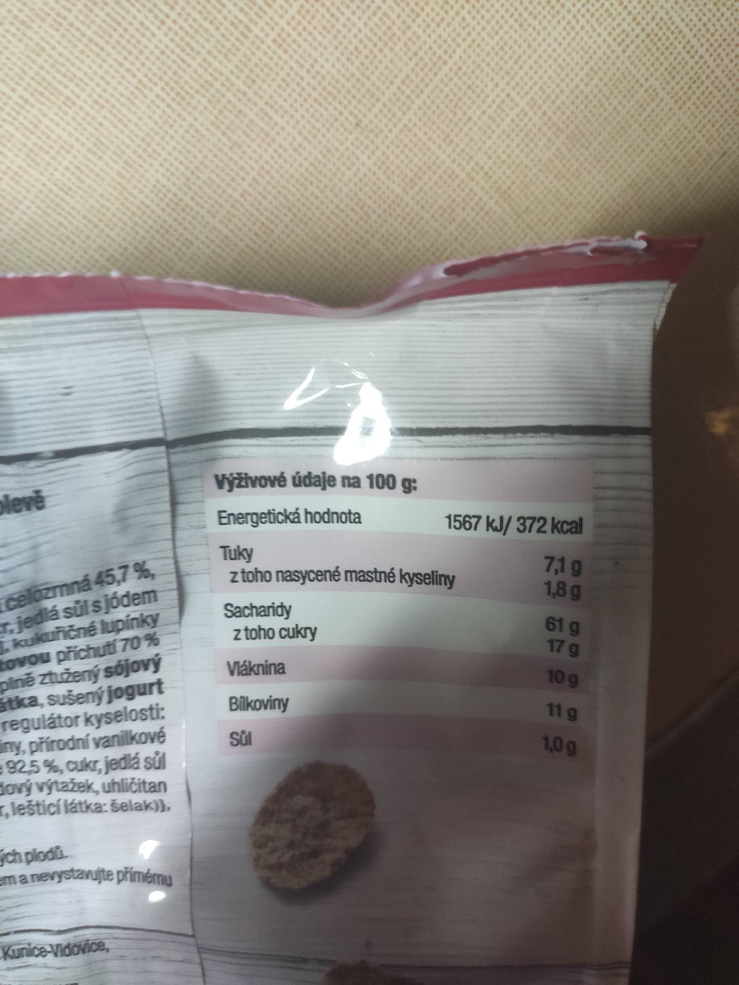 Směs špaldových lupínků s kukuřičnými lupínky v polevě s jogurtovou příchutí, s lyofilizovanými višněmi.