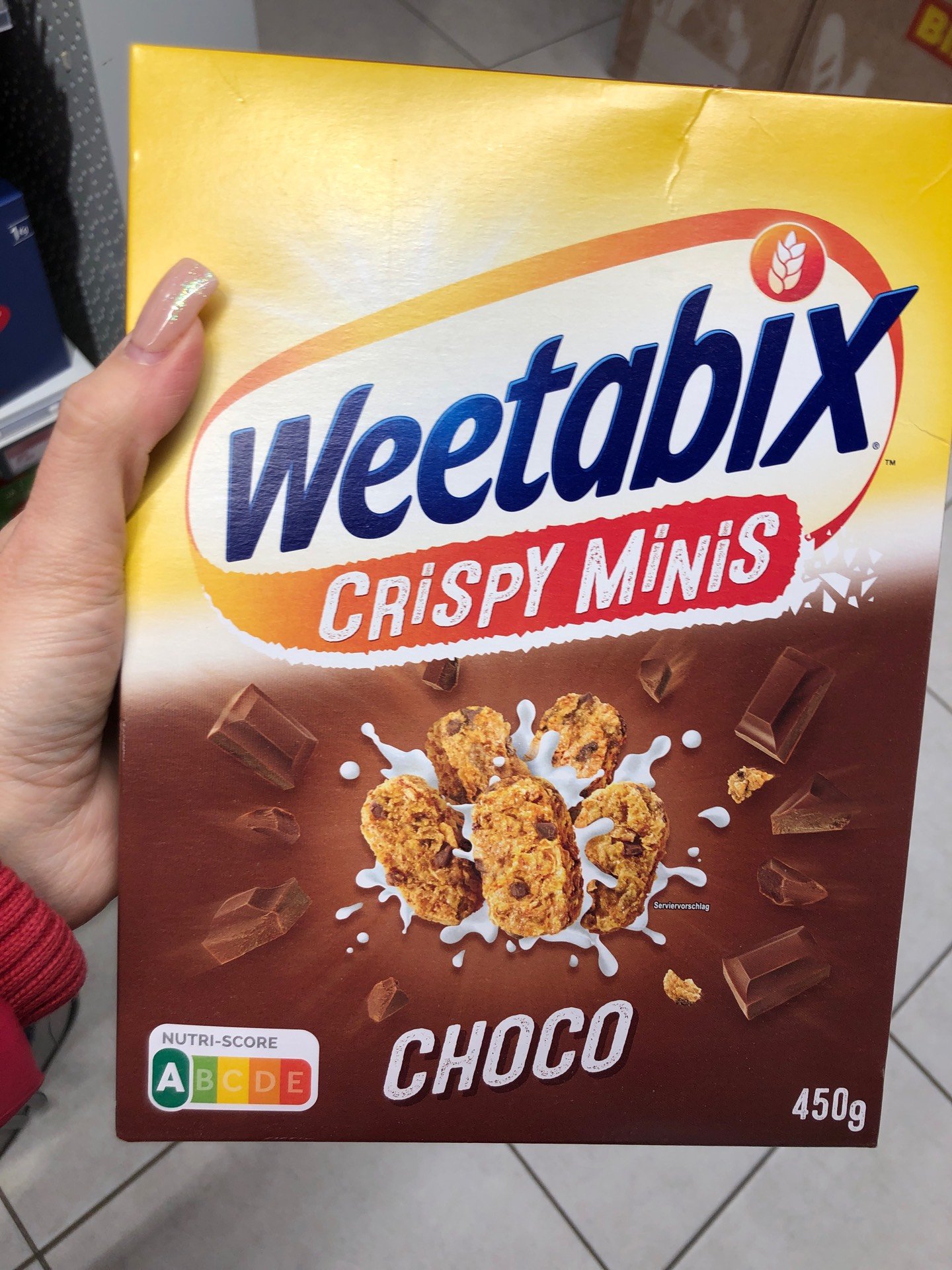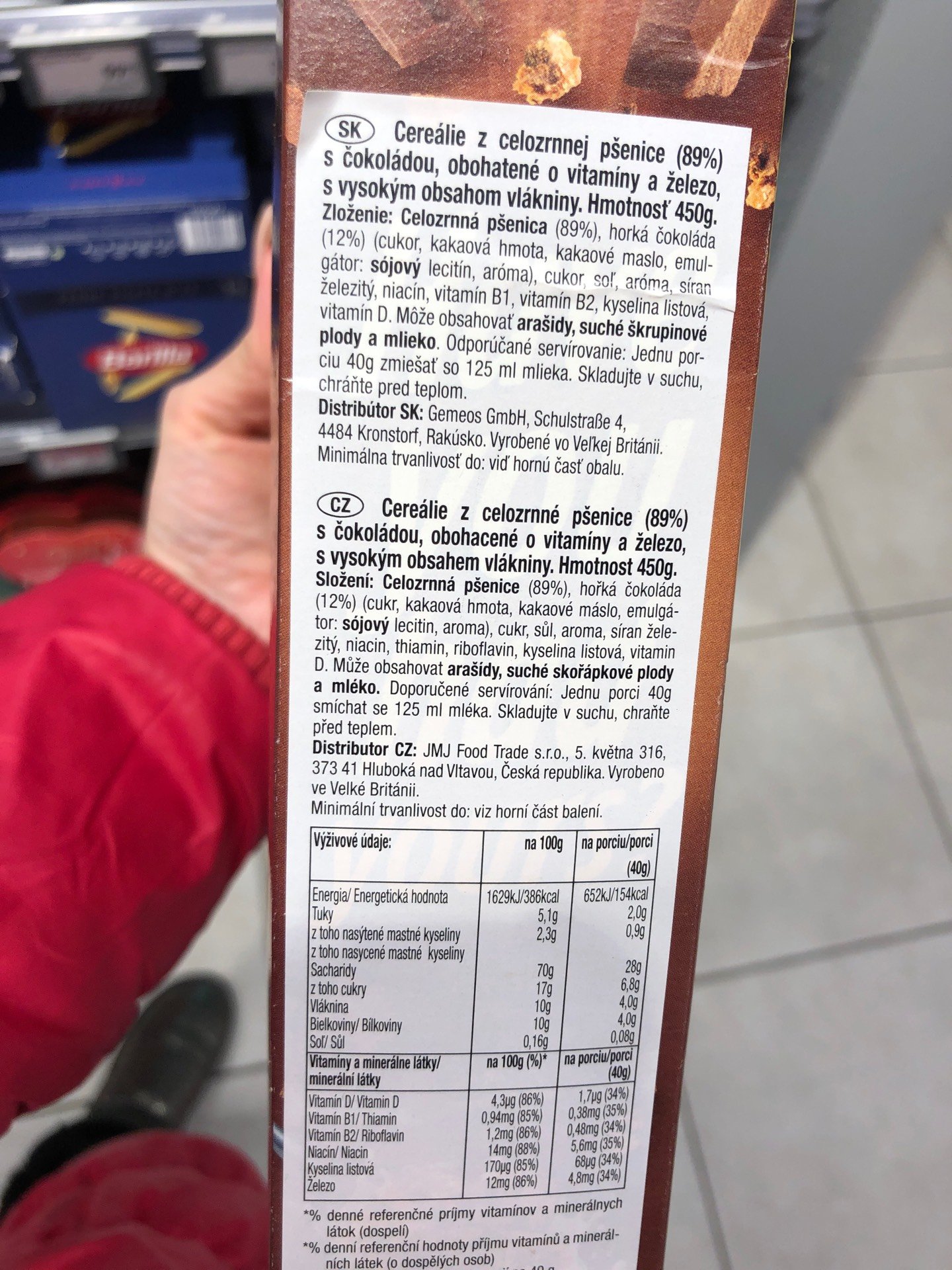 Cereálie z celozrnné pšenice 89% s čokoládou, obohacené o vitamíny a železo, s vysokým obsahem vlákniny.