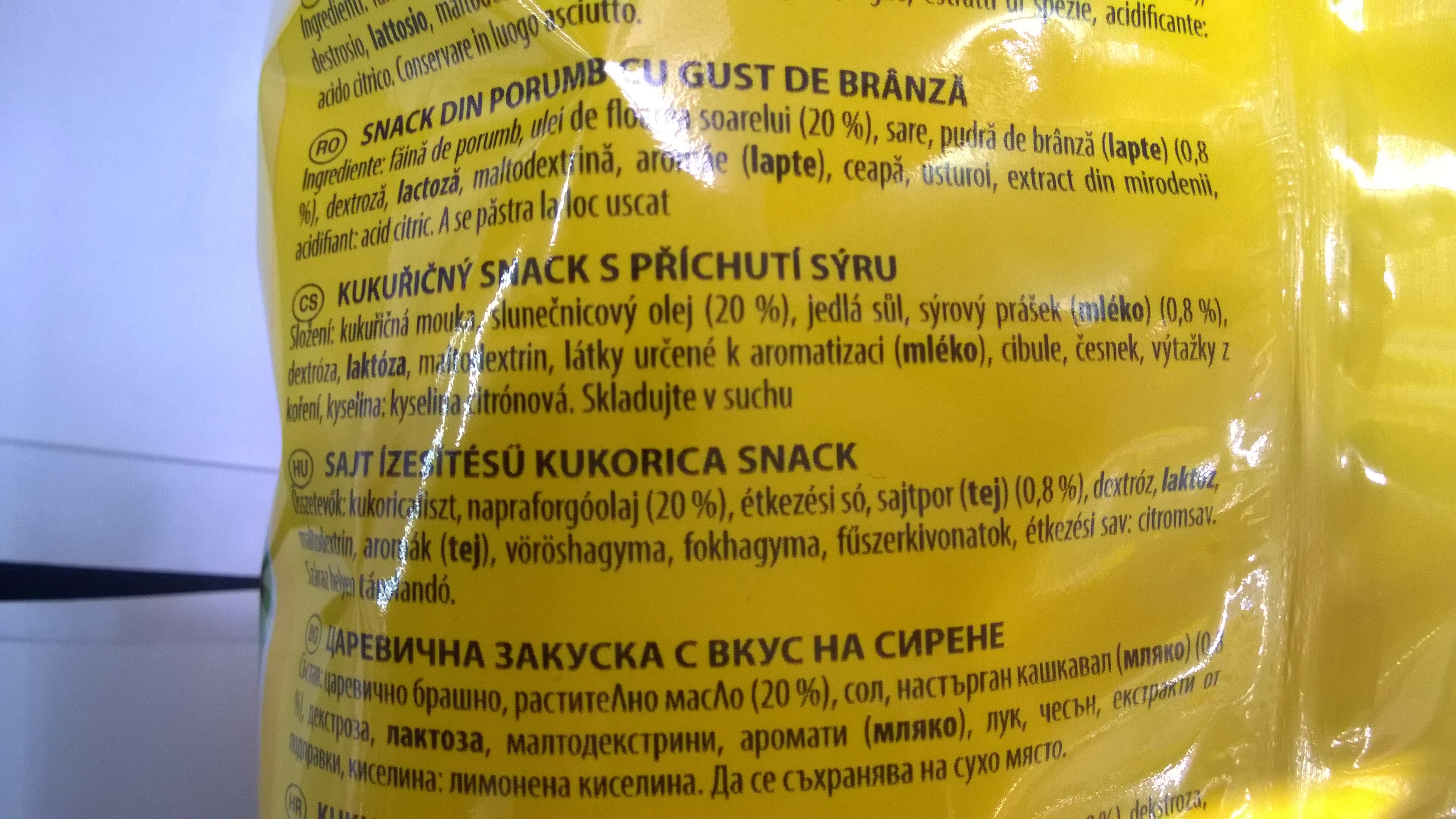 Kukuřičný snack pečený, osmažený. S příchutí sýra.