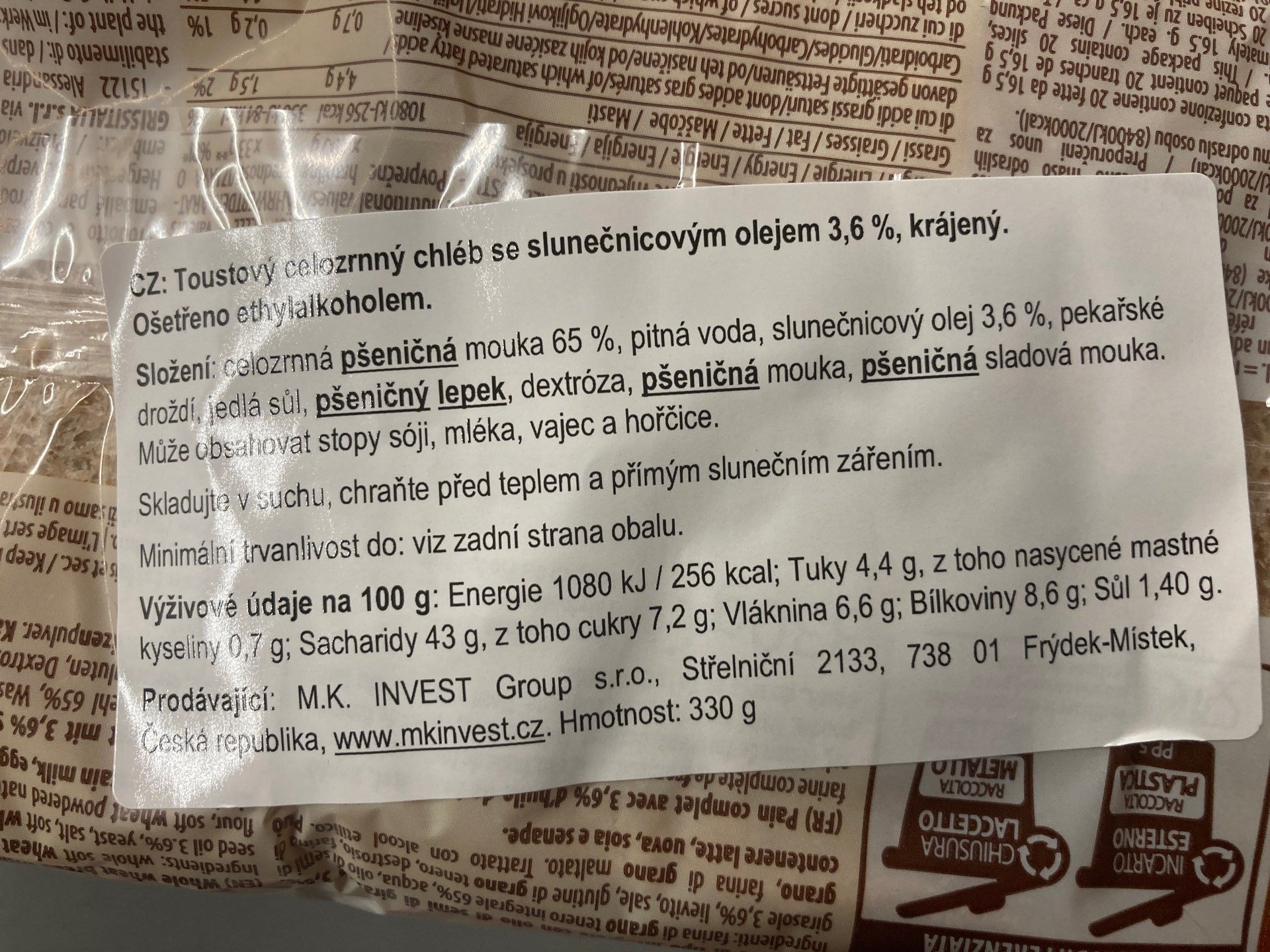 Toustový celozrnný chléb se slunečnicovým olejem 3,6%, krájený.