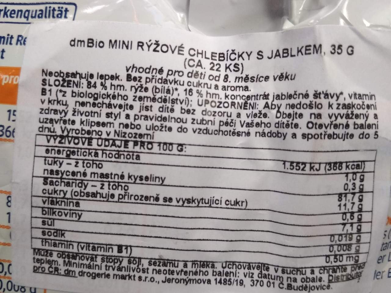 dmBio-Mini rýžové chlebíčky s jablkem. Vhodné pro děti od 8. měsíce věku. Neobsahuje lepek. Bez přídavku cukru a aroma.