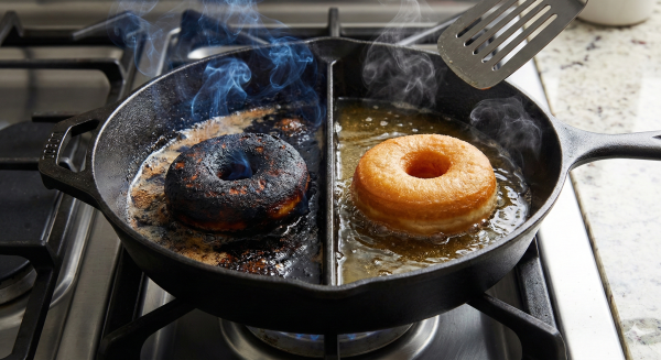 Teplota je základ: Olej nesmí být studený (kobliha nasákne tukem) ani se z něj kouřit (přepaluje se). Správnou teplotu (cca 175 °C) poznáte tak, že do oleje ponoříte konec dřevěné vařečky. Pokud se kolem ní ihned začnou tvořit jemné bublinky, můžete smažit.