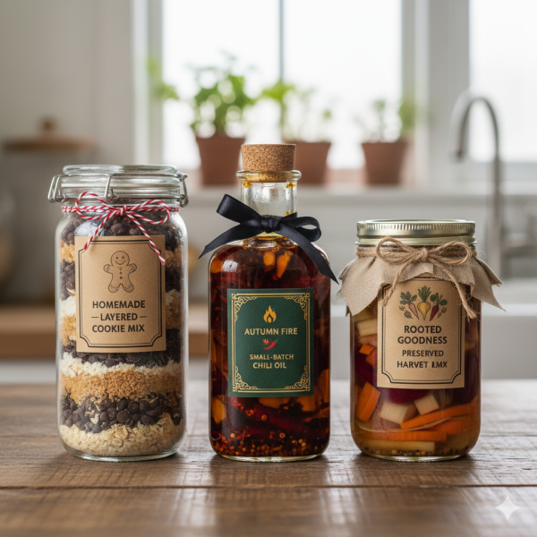 Směs na sušenky (Cookie Mix): Do velké sklenice vrstvěte ingredience (mouka, prášek do pečiva, sůl, cukr, čokoládové kousky, ořechy/semínka). Přiložte papírovou visačku s návodem (co přidat – vejce, máslo – a jak dlouho péct).