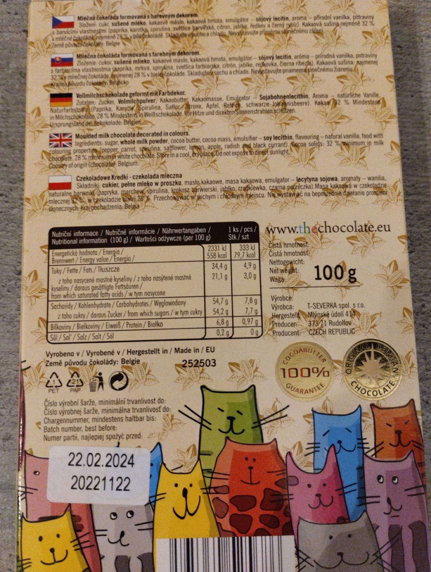 Obsah kakaové sušiny v mléčné čokoládě min. 32%, v bílé čokoládě min. 27%