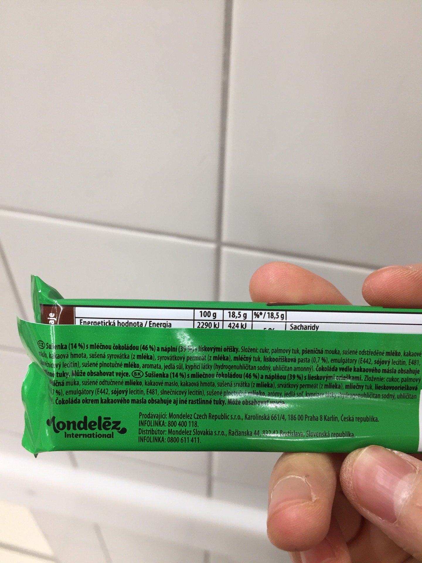 Sušenka s mléčnou čokoládou (46%) a náplní (39%) s lískovými oříšky.