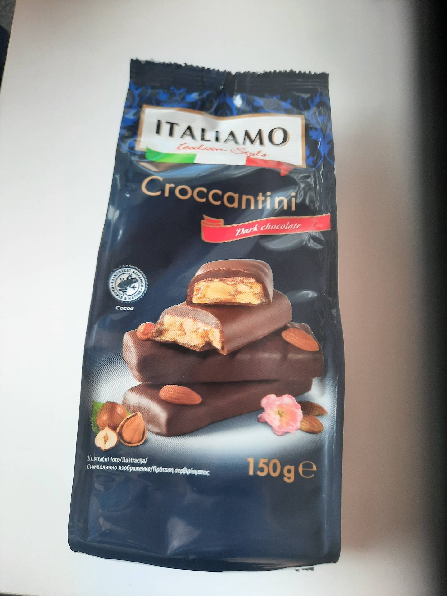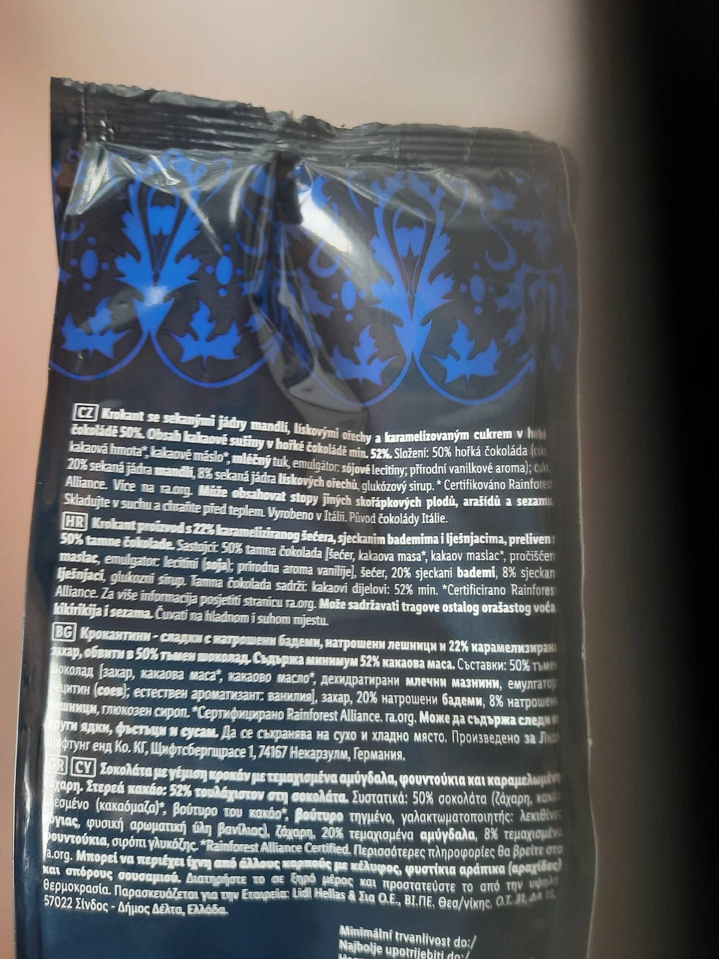 Krokant se sekanými jádry mandlí, lískovými ořechy a karamelizovaným cukrem v hořké čokoládě 50%.