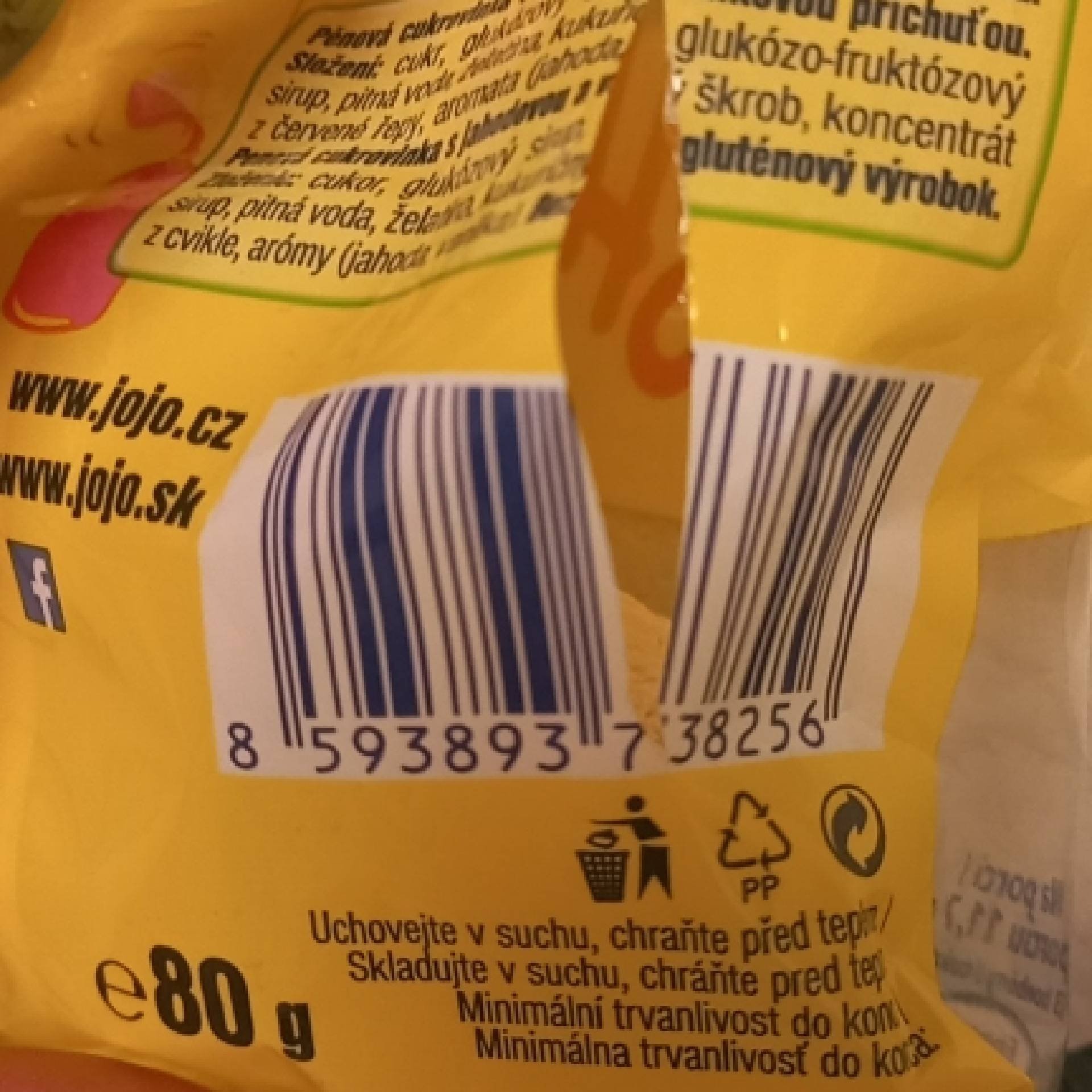 Pěnová cukrovinka s jahodovou a vanilkovou příchutí.