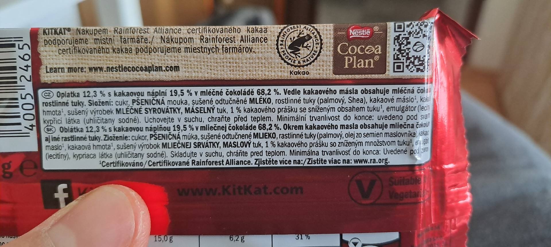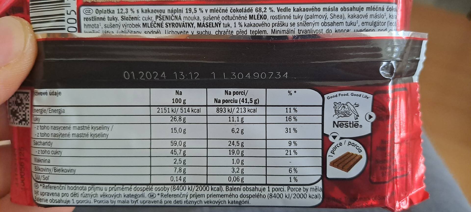 Oplatka 12,3 % s kakaovou náplní 19,5 % v mléčné čokoládě 68,2 %.