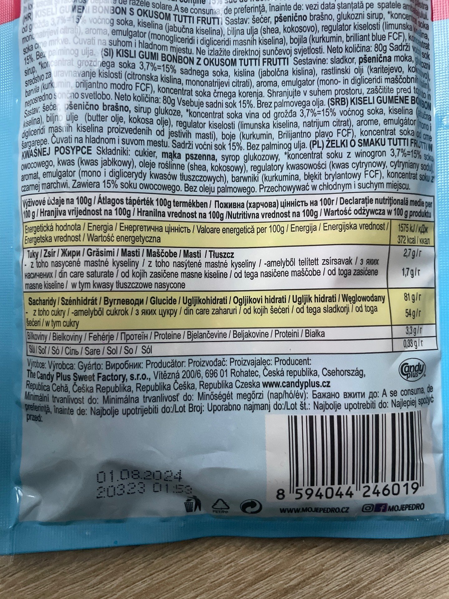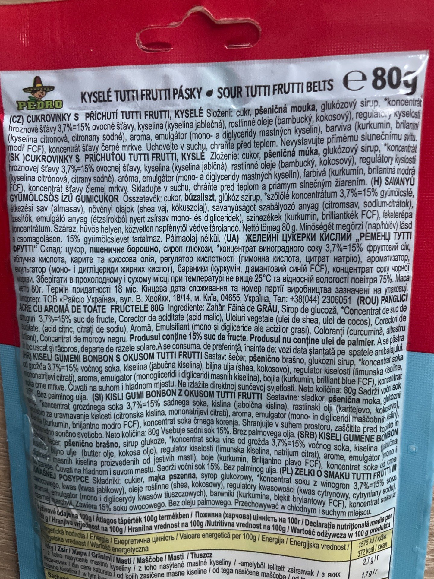 Cukrovinky s příchutí Tutti Frutti, kyselé.