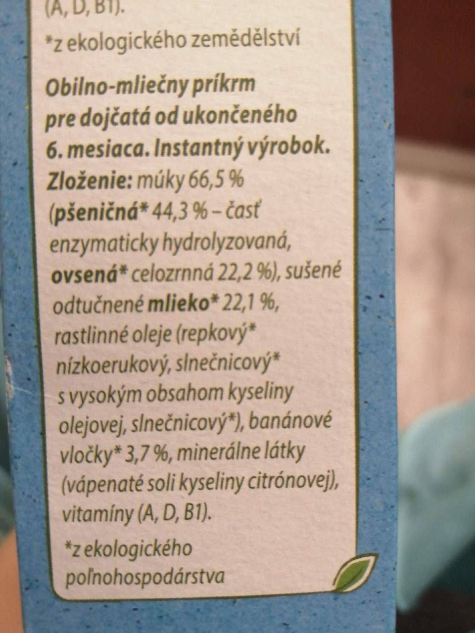 Nestlé mléčná obilná Bio kaše banánová. Obilno-mléčný příkrm pro kojence od ukončeného 6. měsíce. Instantní výrobek.