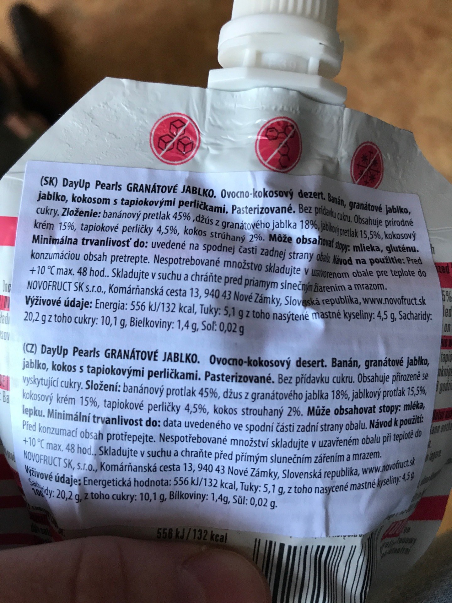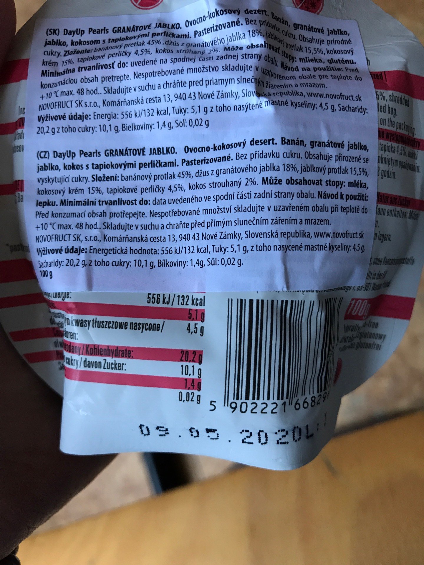 DayUp Pearls Granátové jablko. Ovocno-kokosový dezert. Banán, granátové jablko, jablko a kokos s tapiokovými perličkami. pasterizované. Bez přídavku cukru. Obsahuje přirozeně se vyskytující cukry.