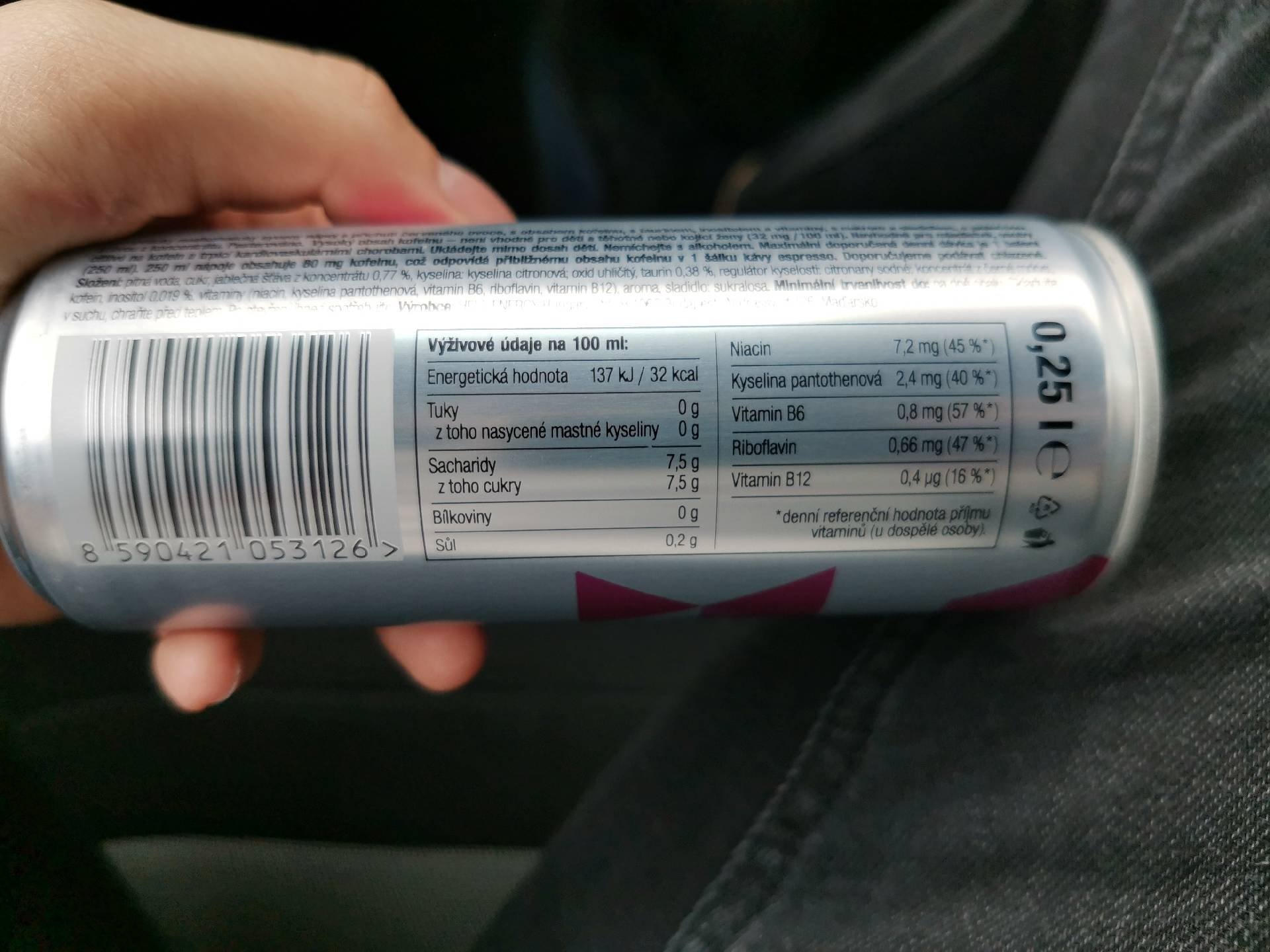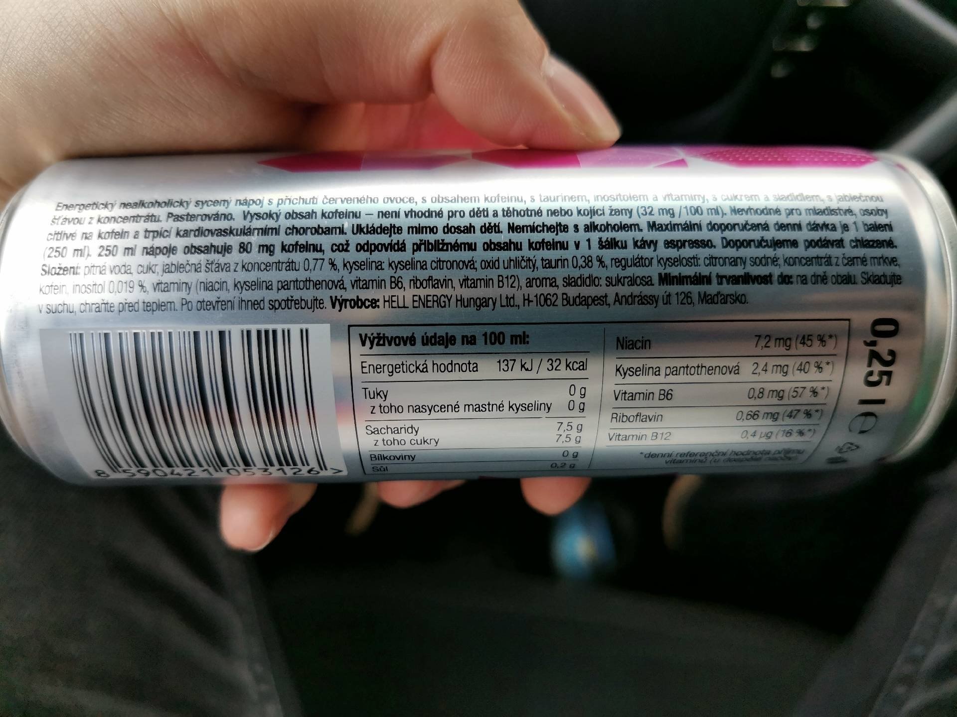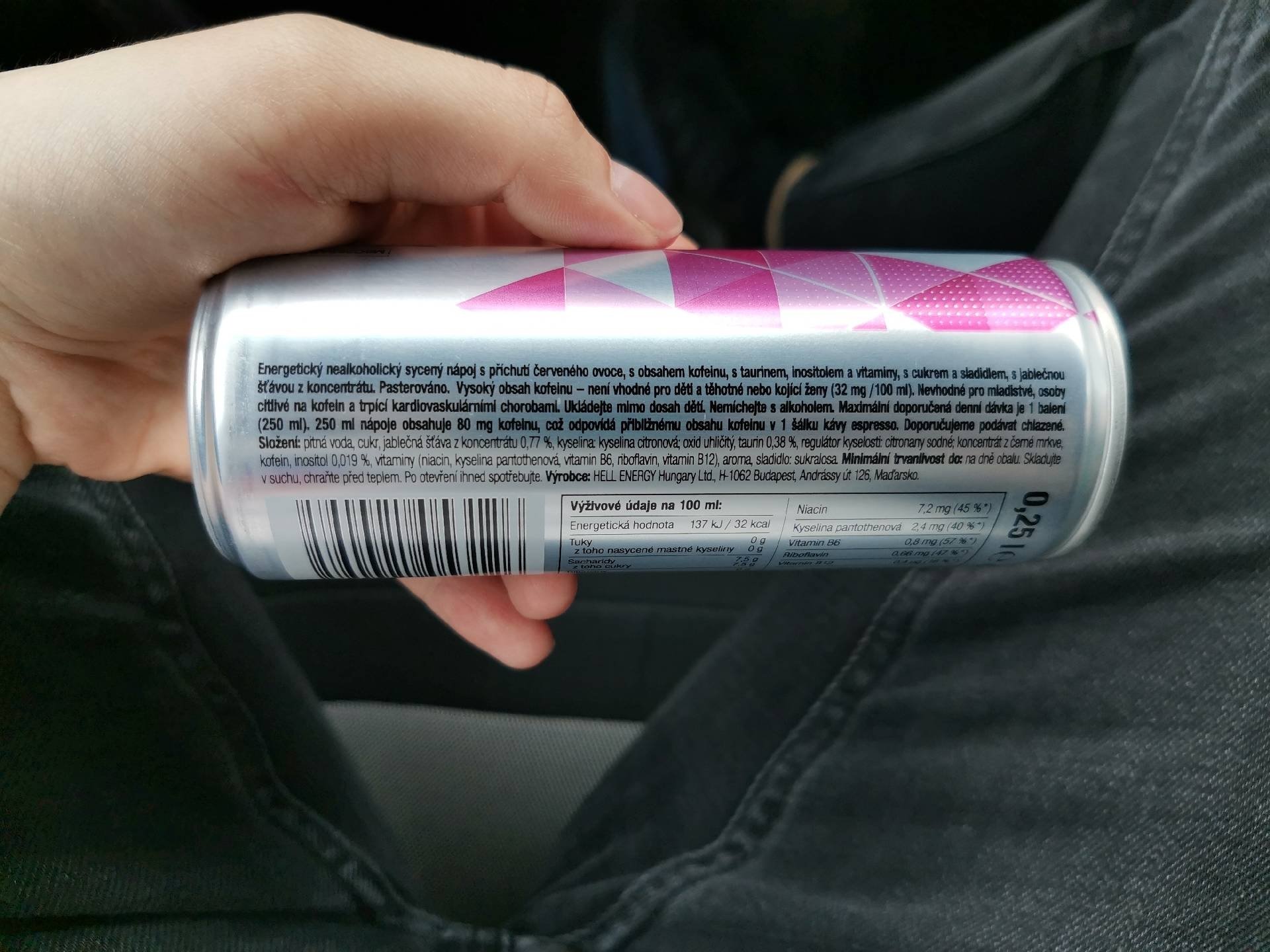 Energetický nealkoholický nápoj sycený s příchutí červeného ovoce, s obsahem kofeinu, s taurinem, inositolem a vitamíny, s cukrem a sladidlem, s jablečnou šťávou z koncentrátu.