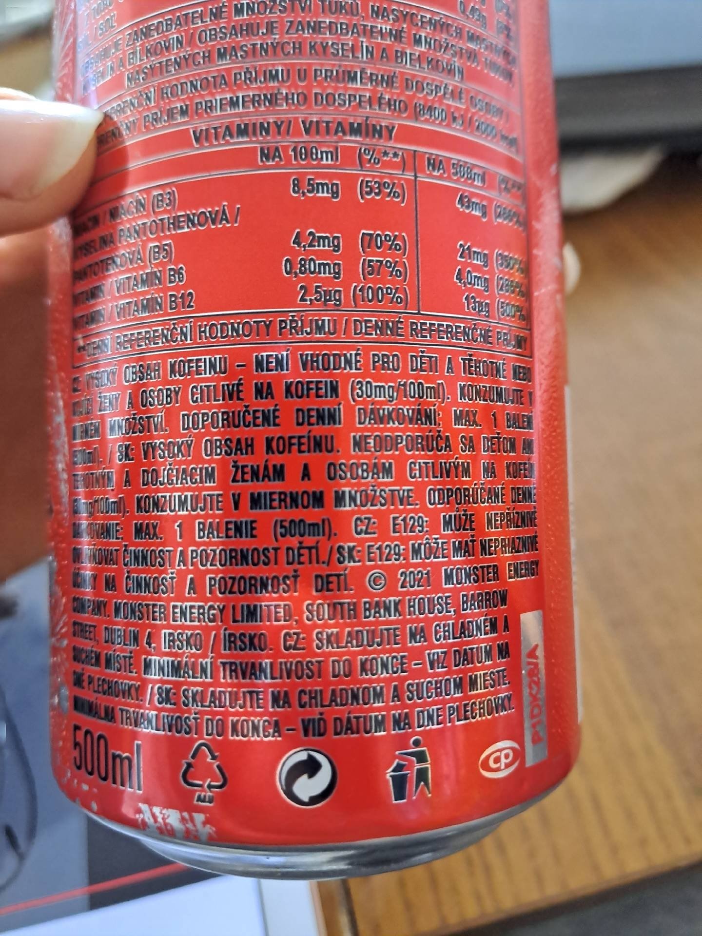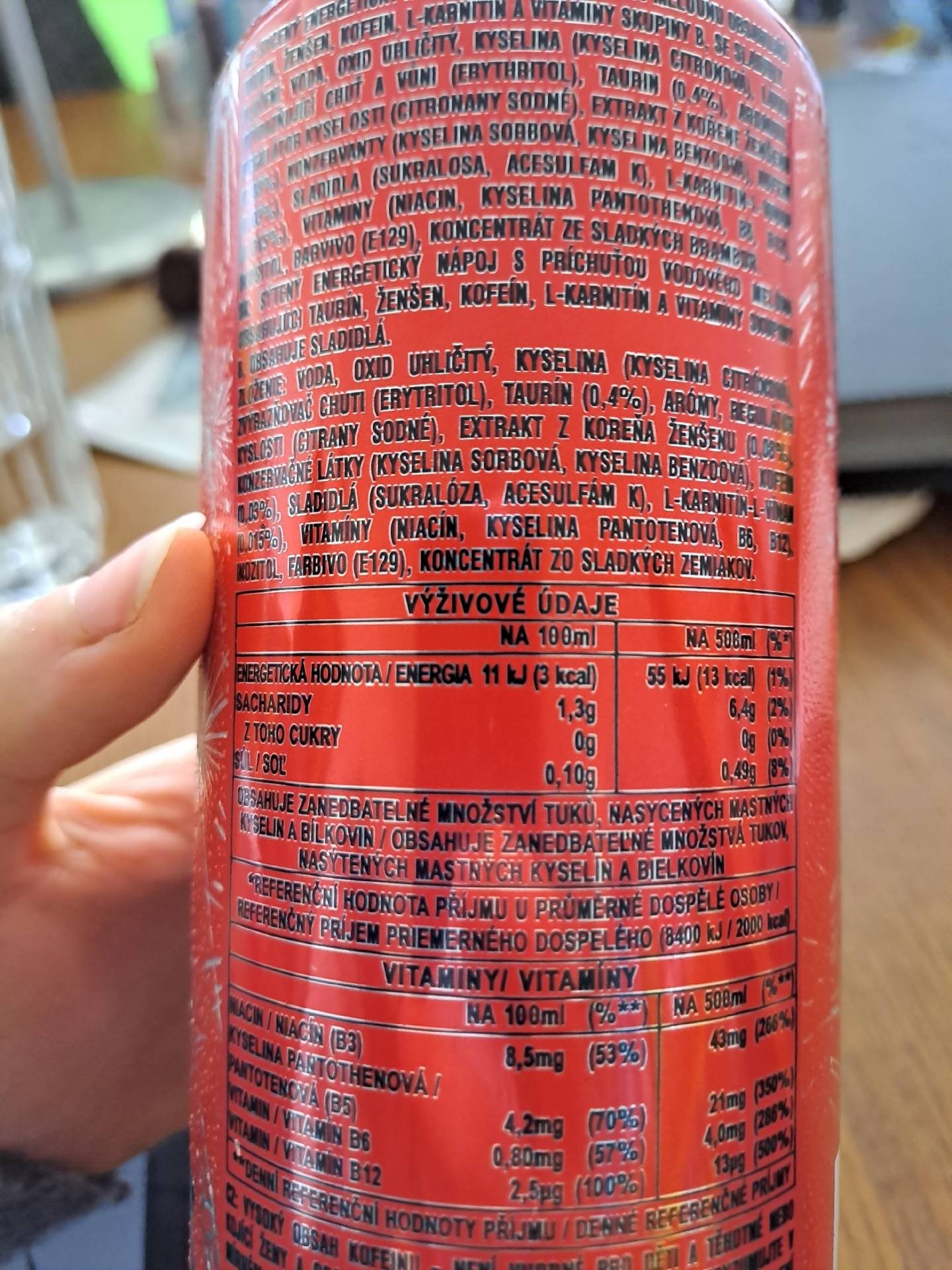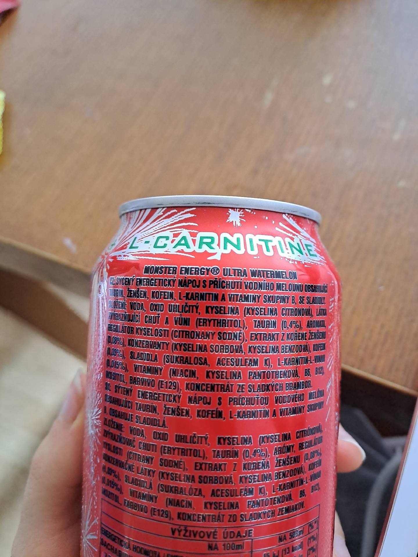 Sycený energetický nápoj s příchutí vodního melounu obsahující taurin, ženšen, kofein, L-Karnitin a vitamíny.