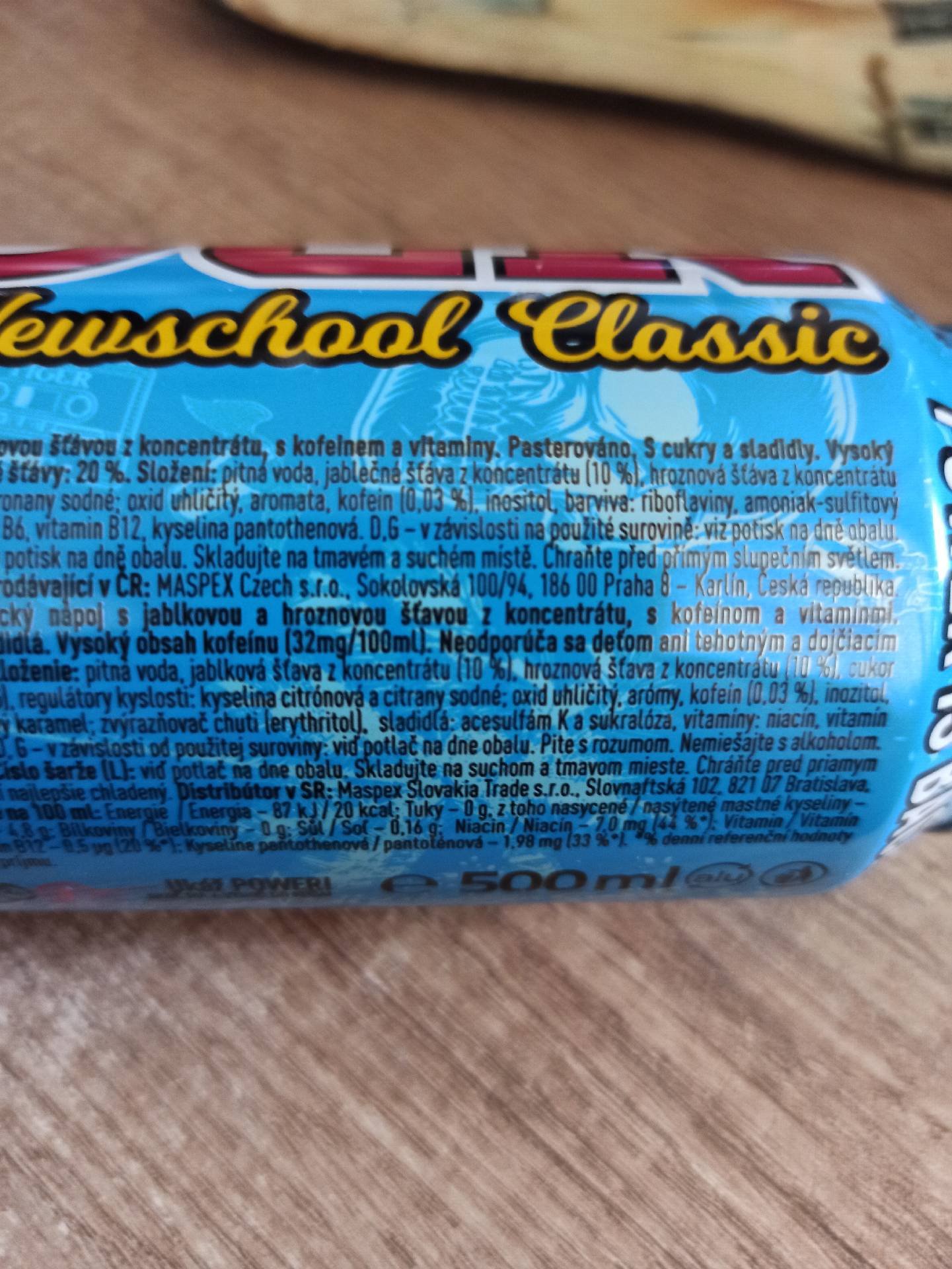 Sycený energetický nealkoholický nápoj s jablečnou a hroznovou šťávou z koncentrátu, s kofeinem a vitamíny.