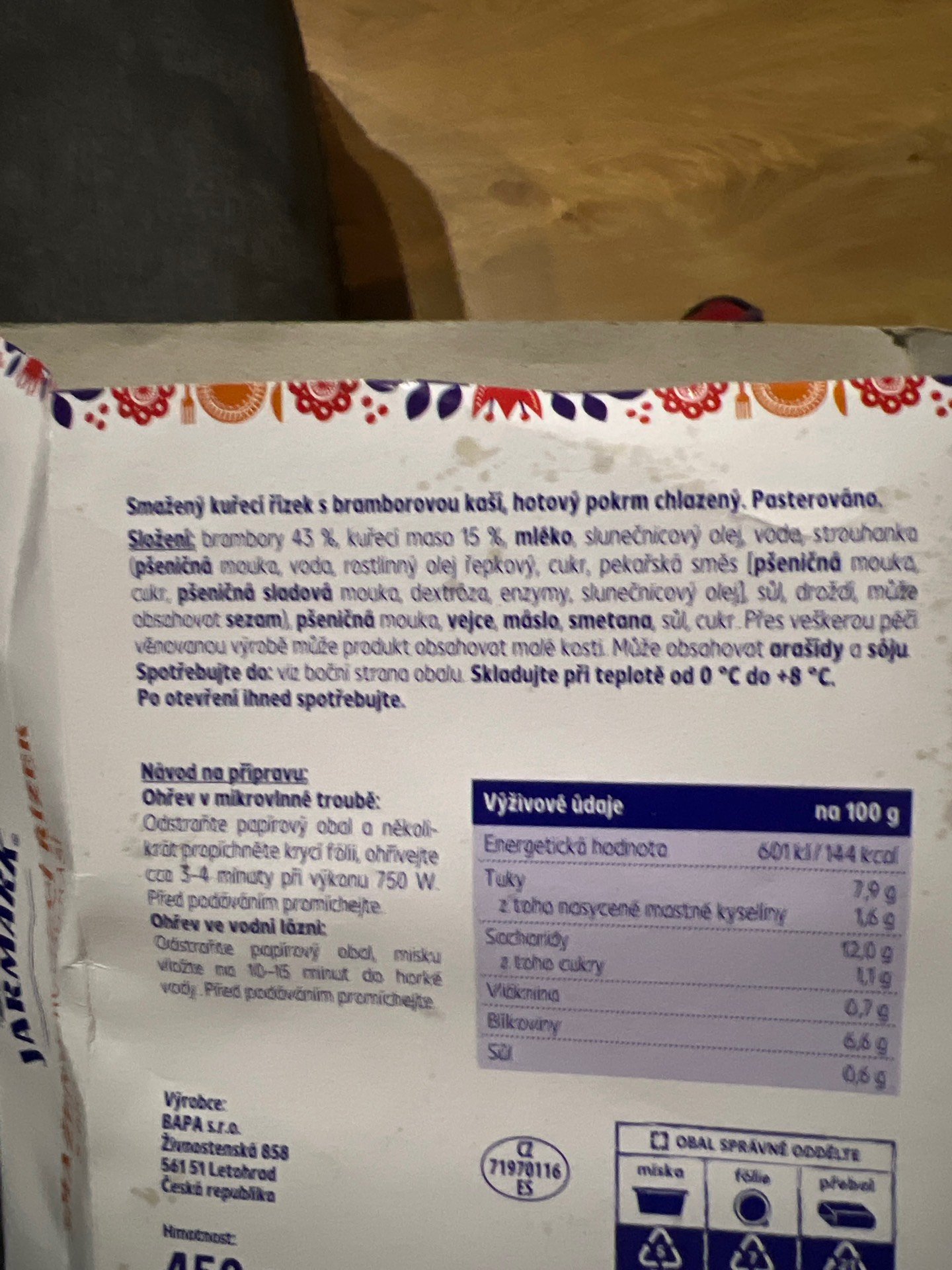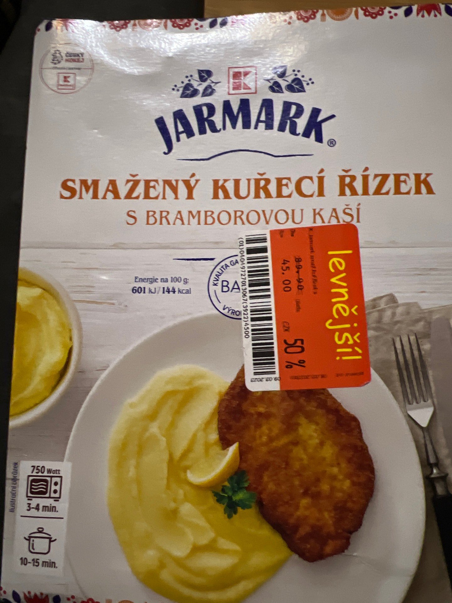 Smažený kuřecí řízek s bramborovou kaší, hotový pokrm chlazený.
