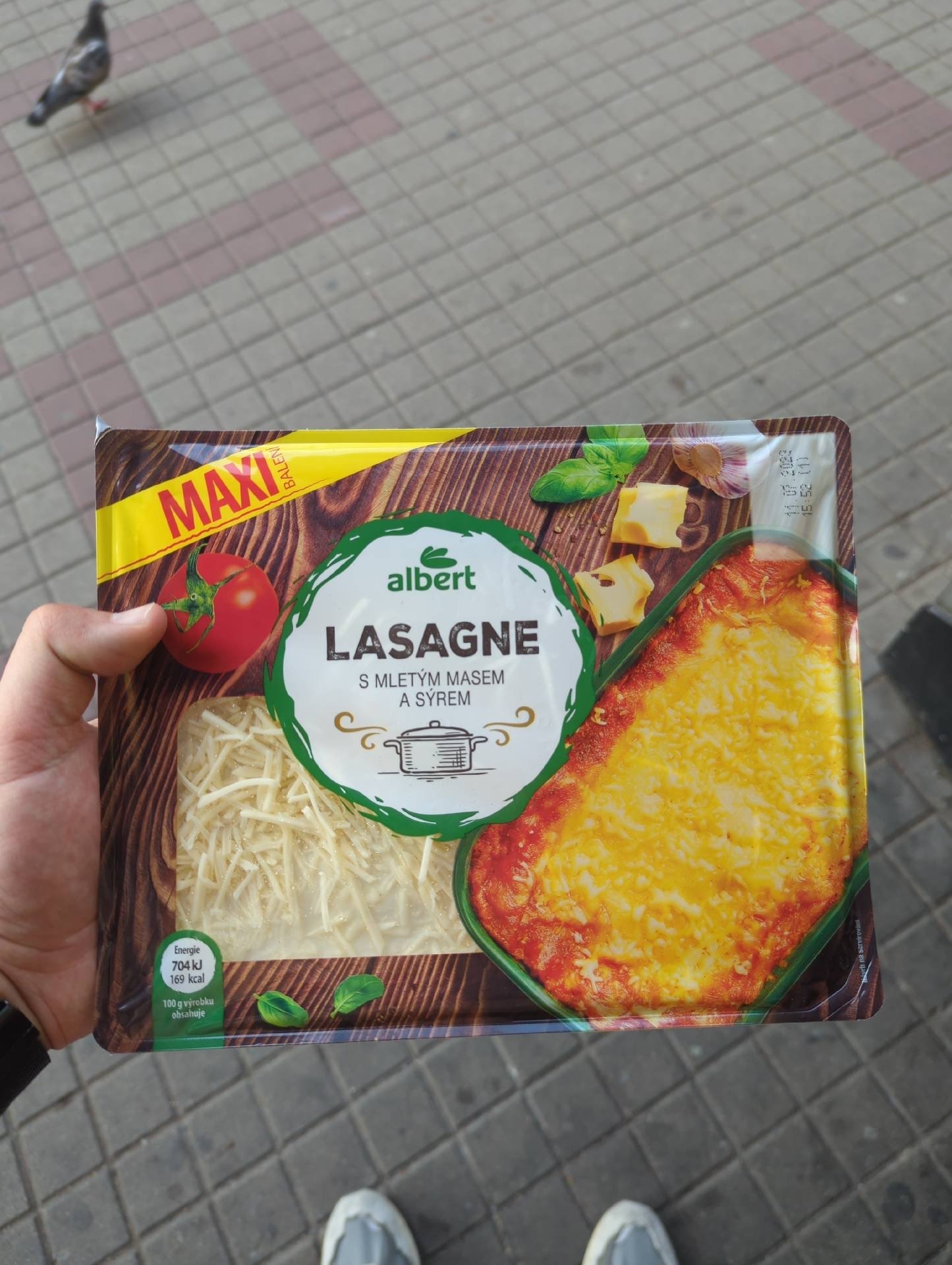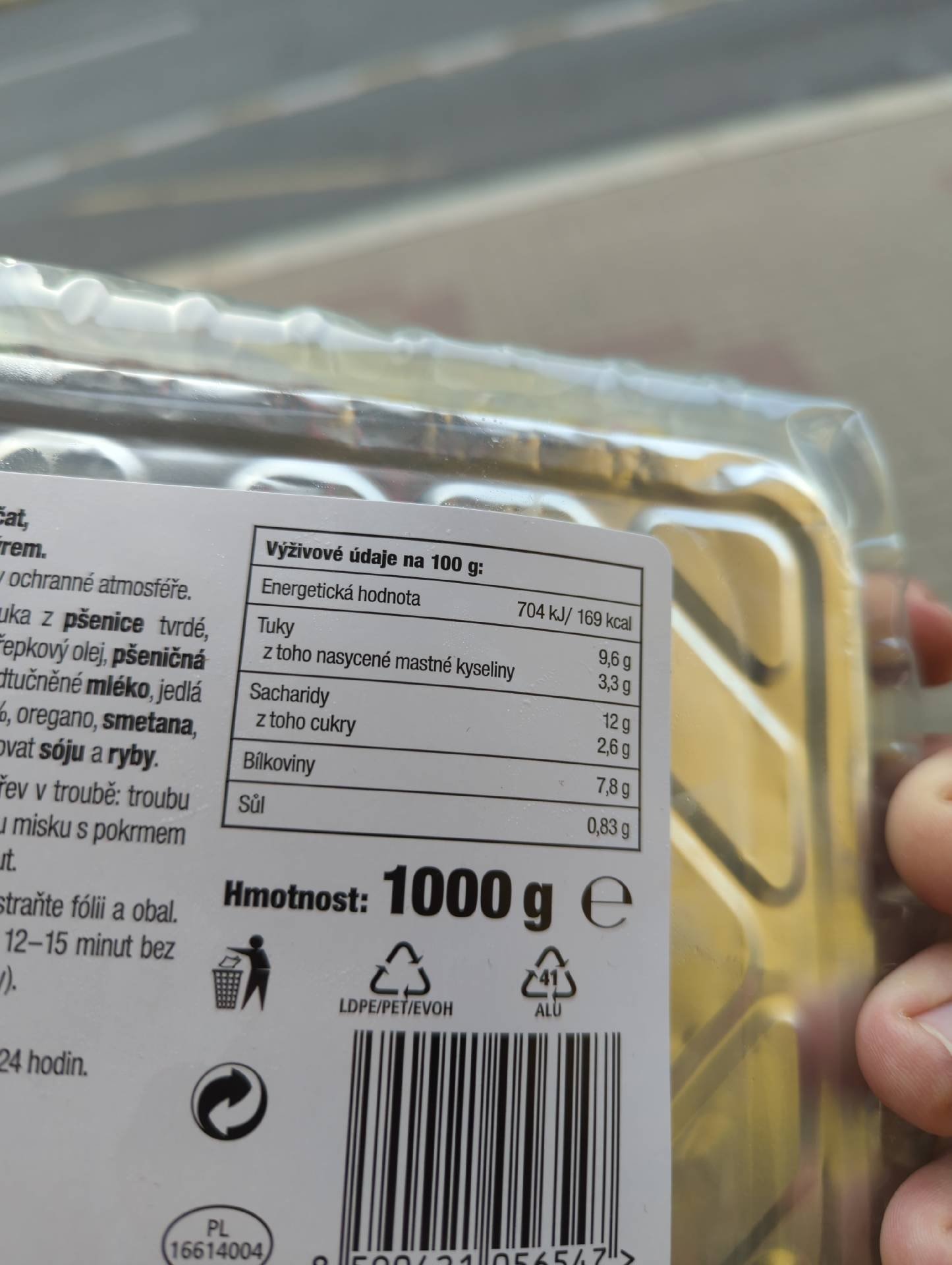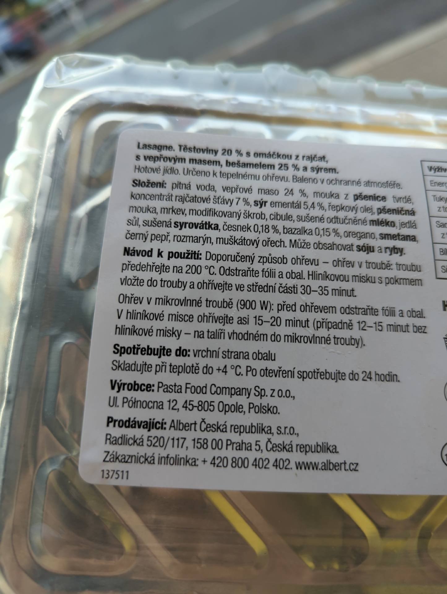 Těstoviny 20% s omáčkou z rajčat, vepřovým masem, bešamelem 25% a sýrem.