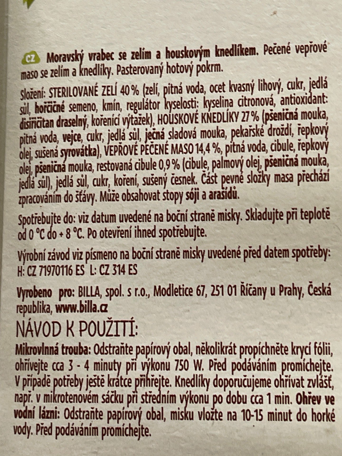 Pečené vepřové maso se zelím a knedlíky. Pasterovaný hotový pokrm