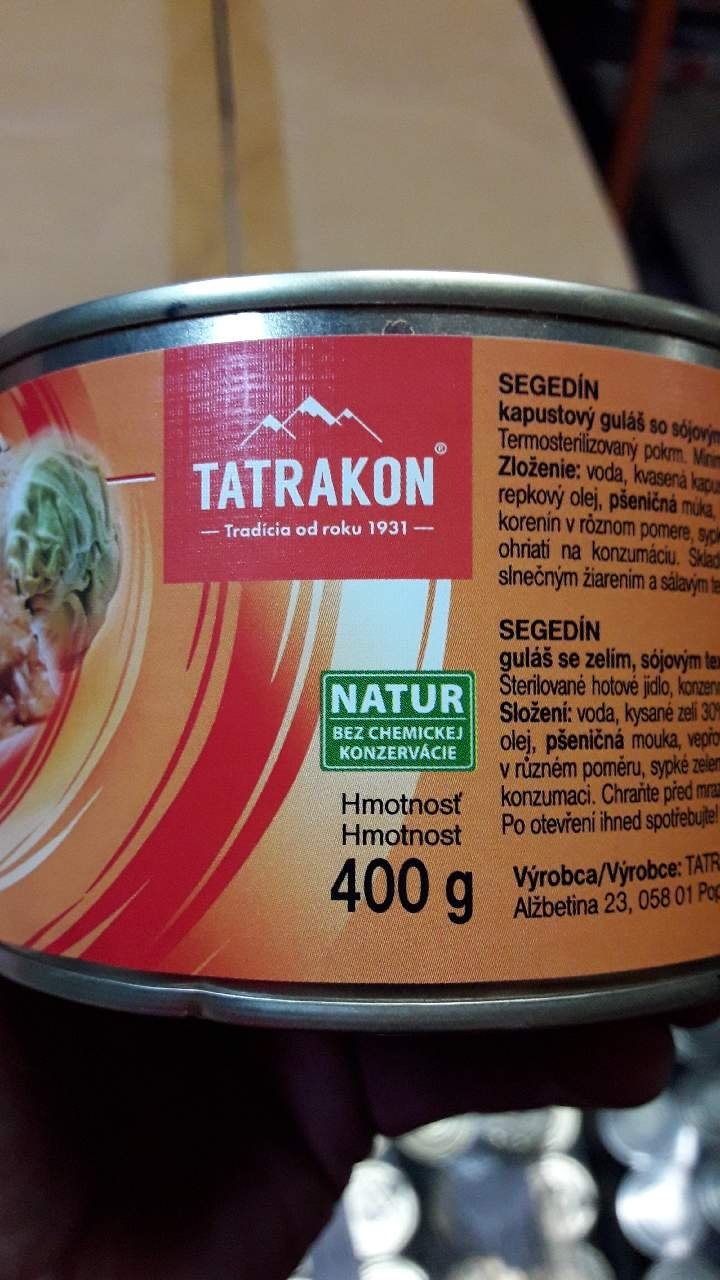 Guláš se zelím, sójovým texturátem a vepřovým masem. Sterilované hotové jídlo.