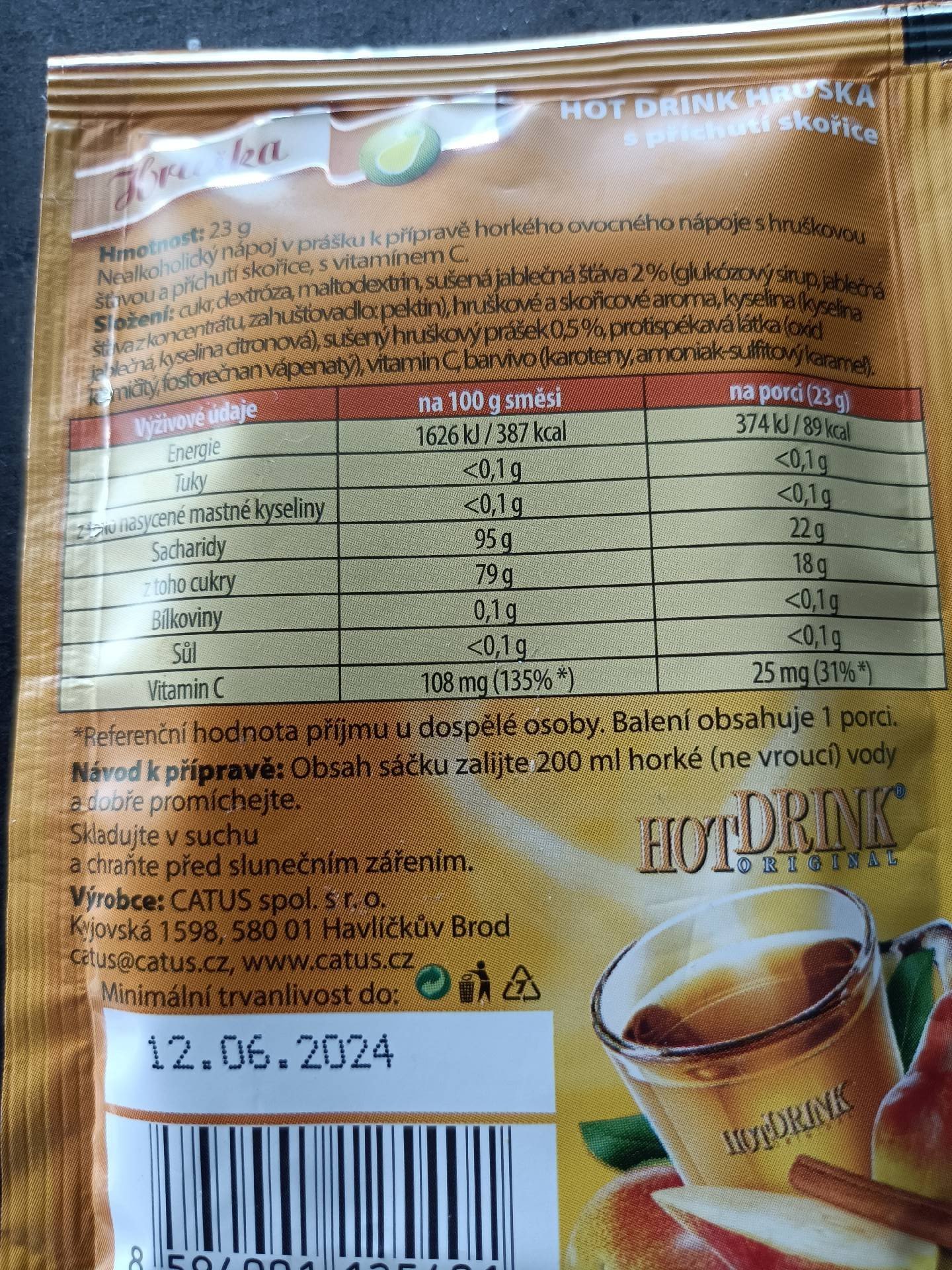 Nealkoholický nápoj v prášku k přípravě horkého ovocného nápoje s hruškovou šťávou a příchutí skořice, s vitamínem C.