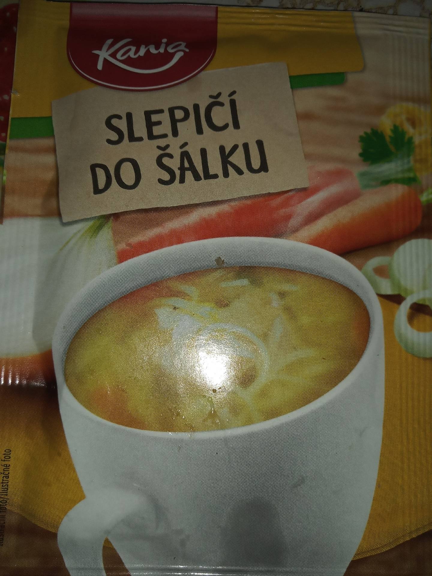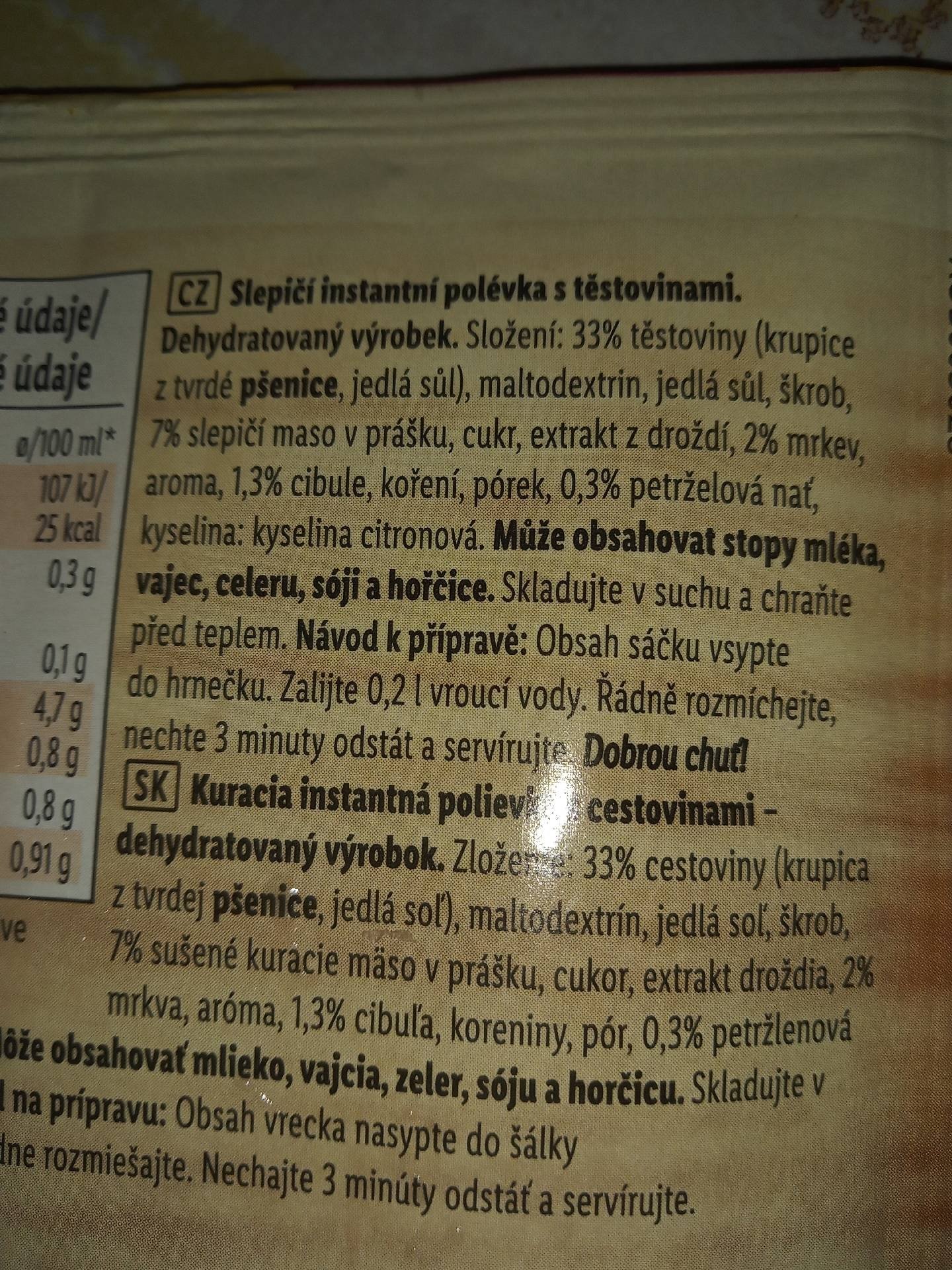 Slepičí instantní polévka s těstovinami.