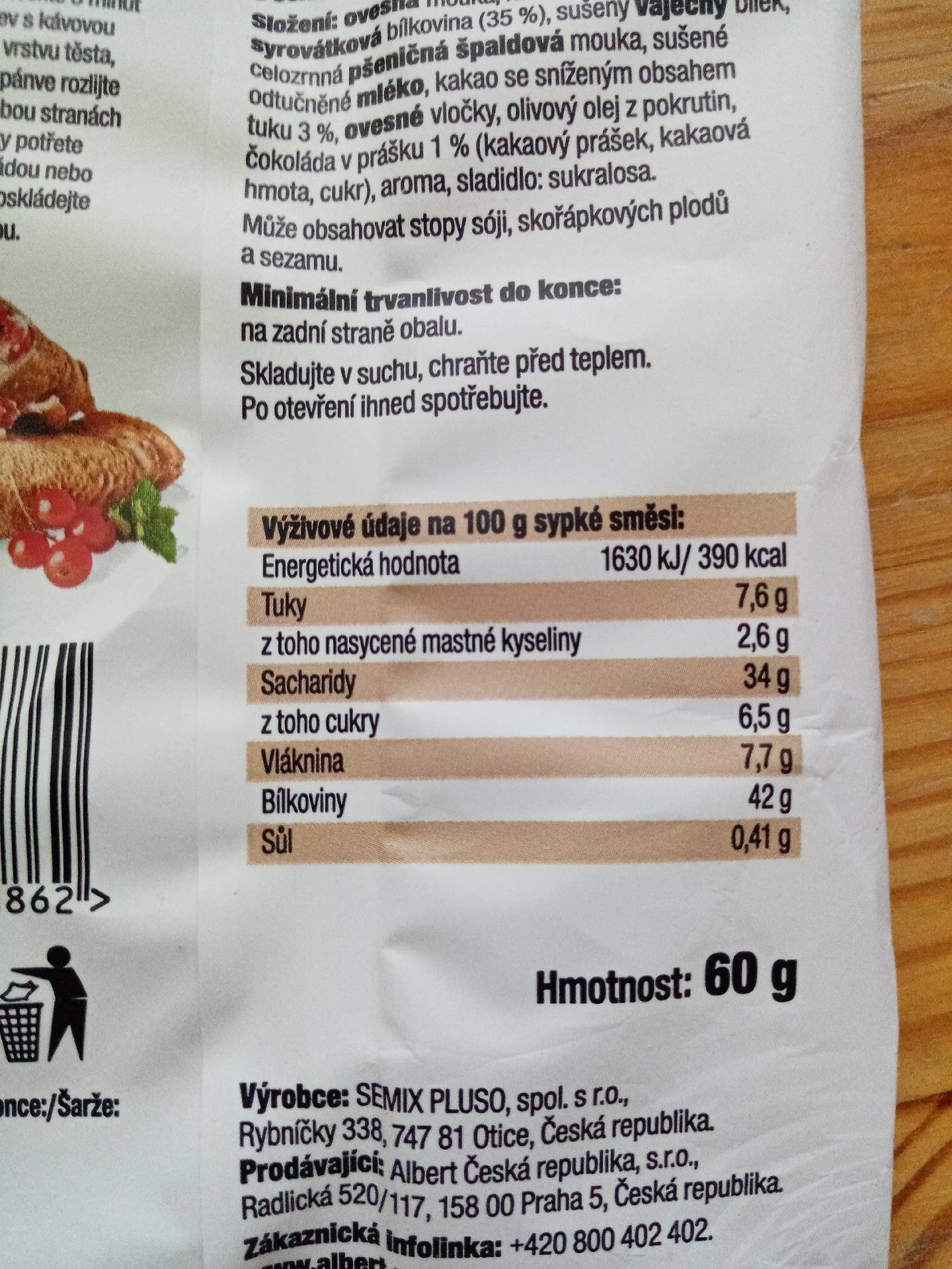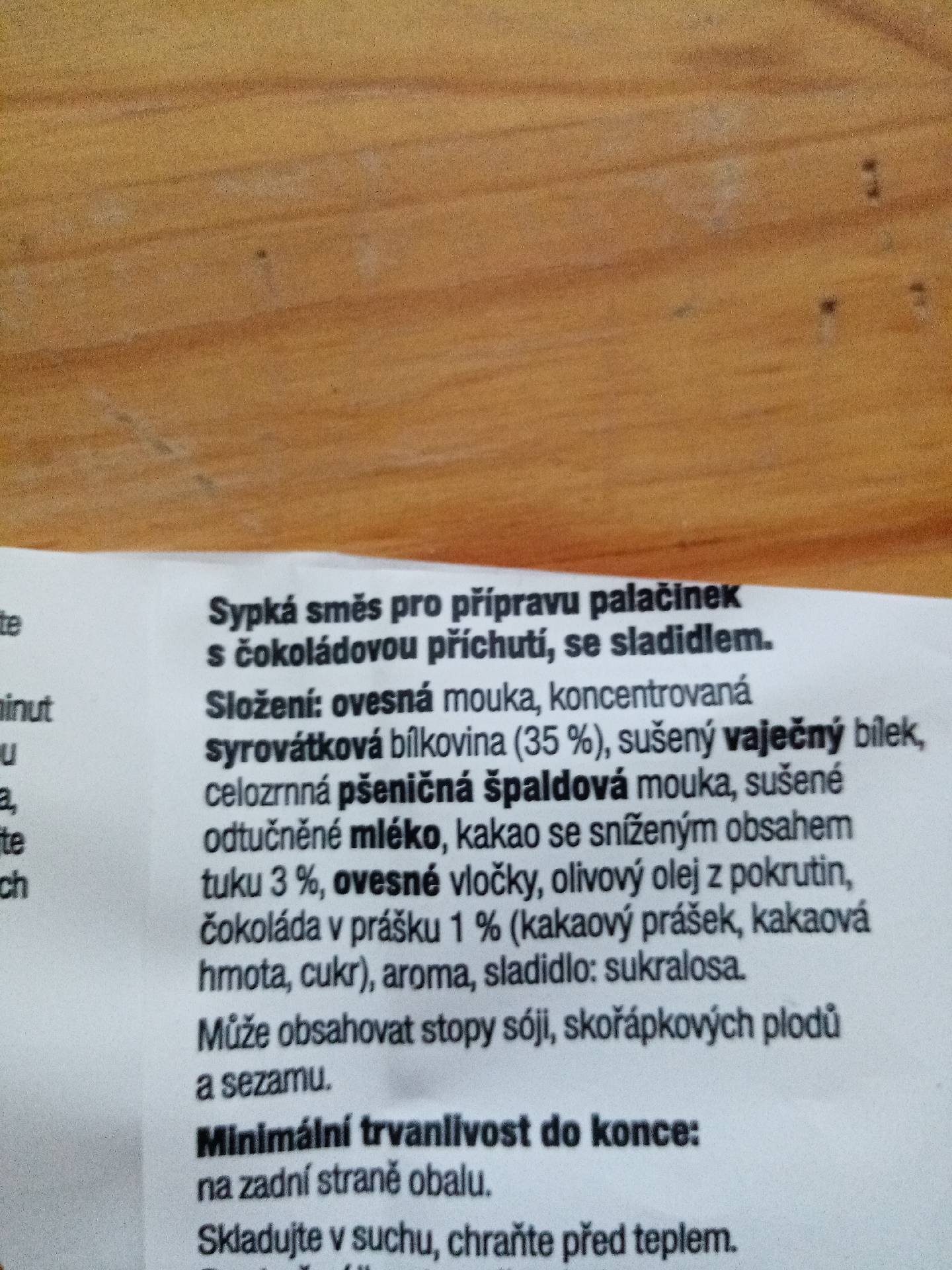 Sypká směs pro přípravu palačinek s čokoládovou příchutí, se sladidlem.