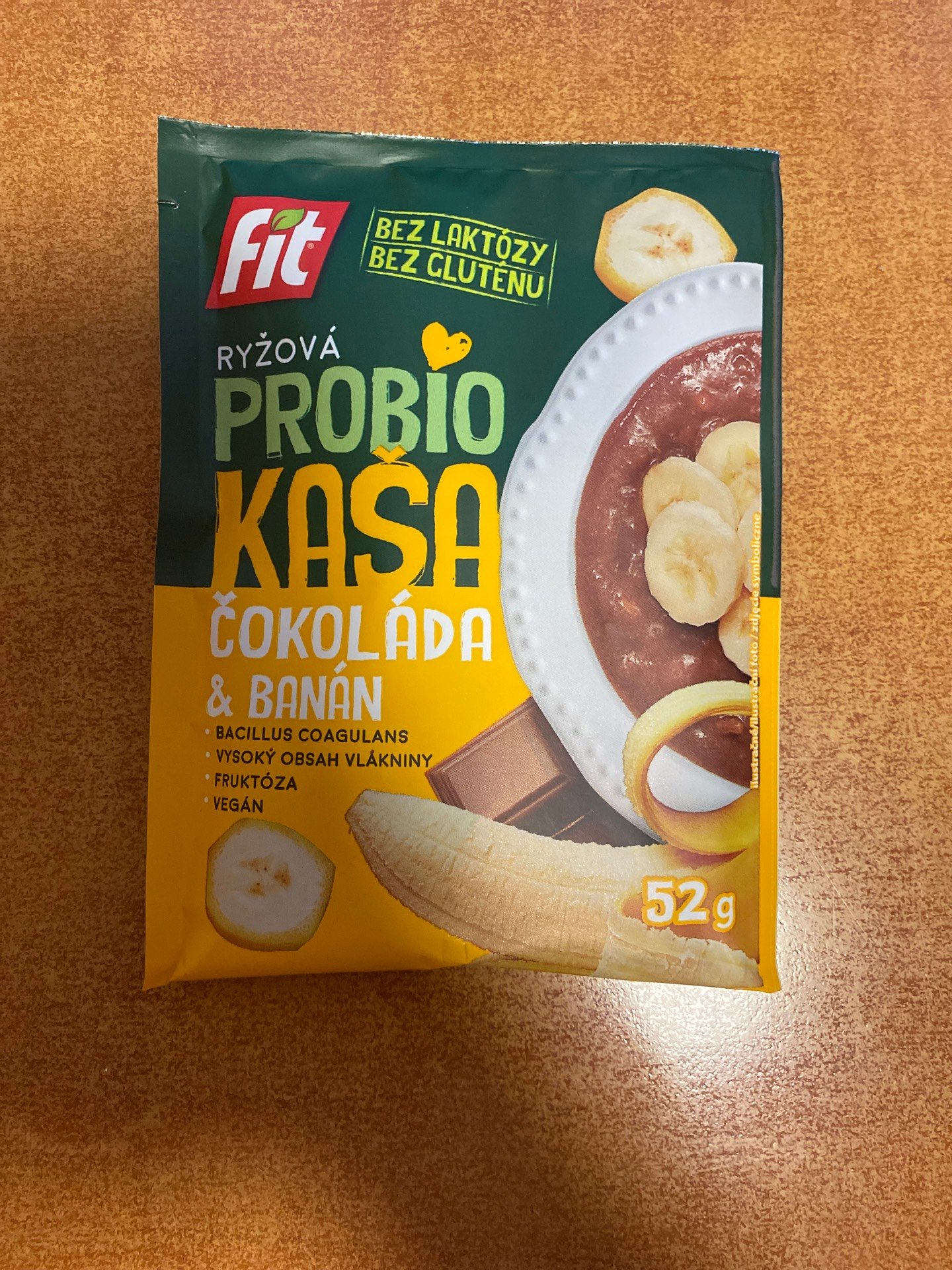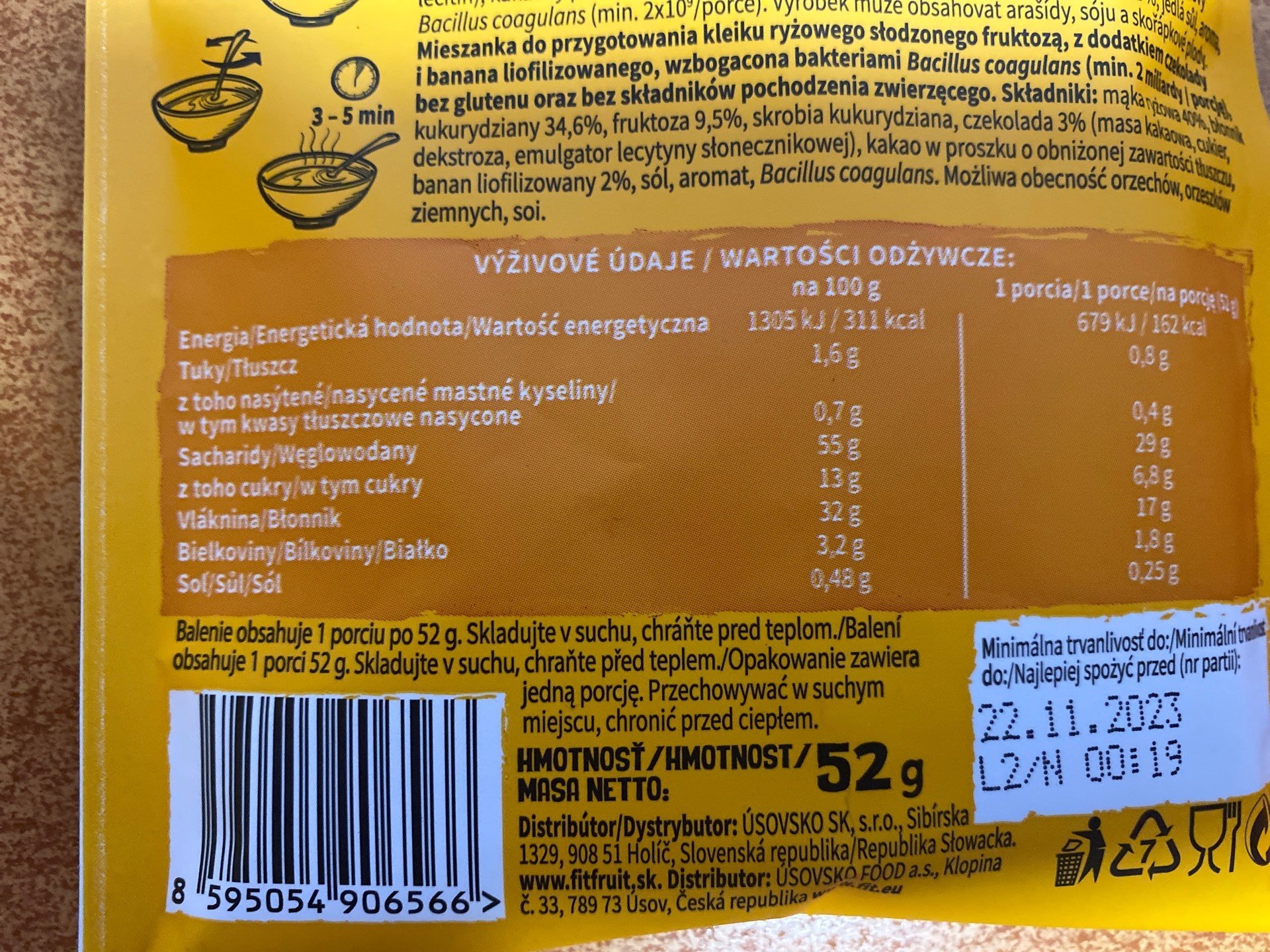 Sypká směs z obilovin pro přípravu rýžové kaše s čokoládou a banánem sušeným mrazem, slazené fruktózou.