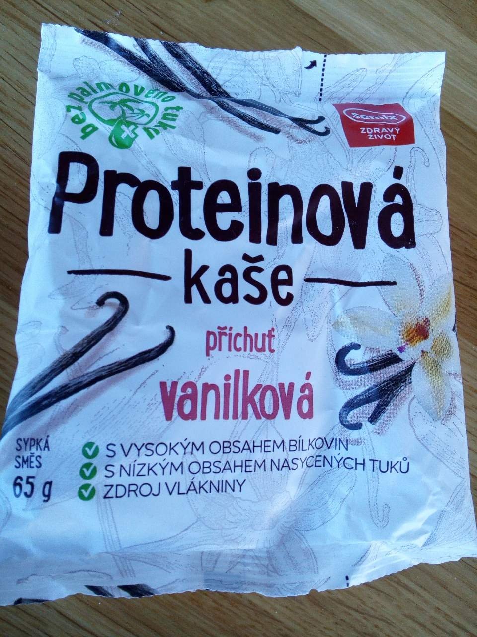 Sypká směs na přípravu proteinové kaše s vanilkovou příchutí se sladidlem.