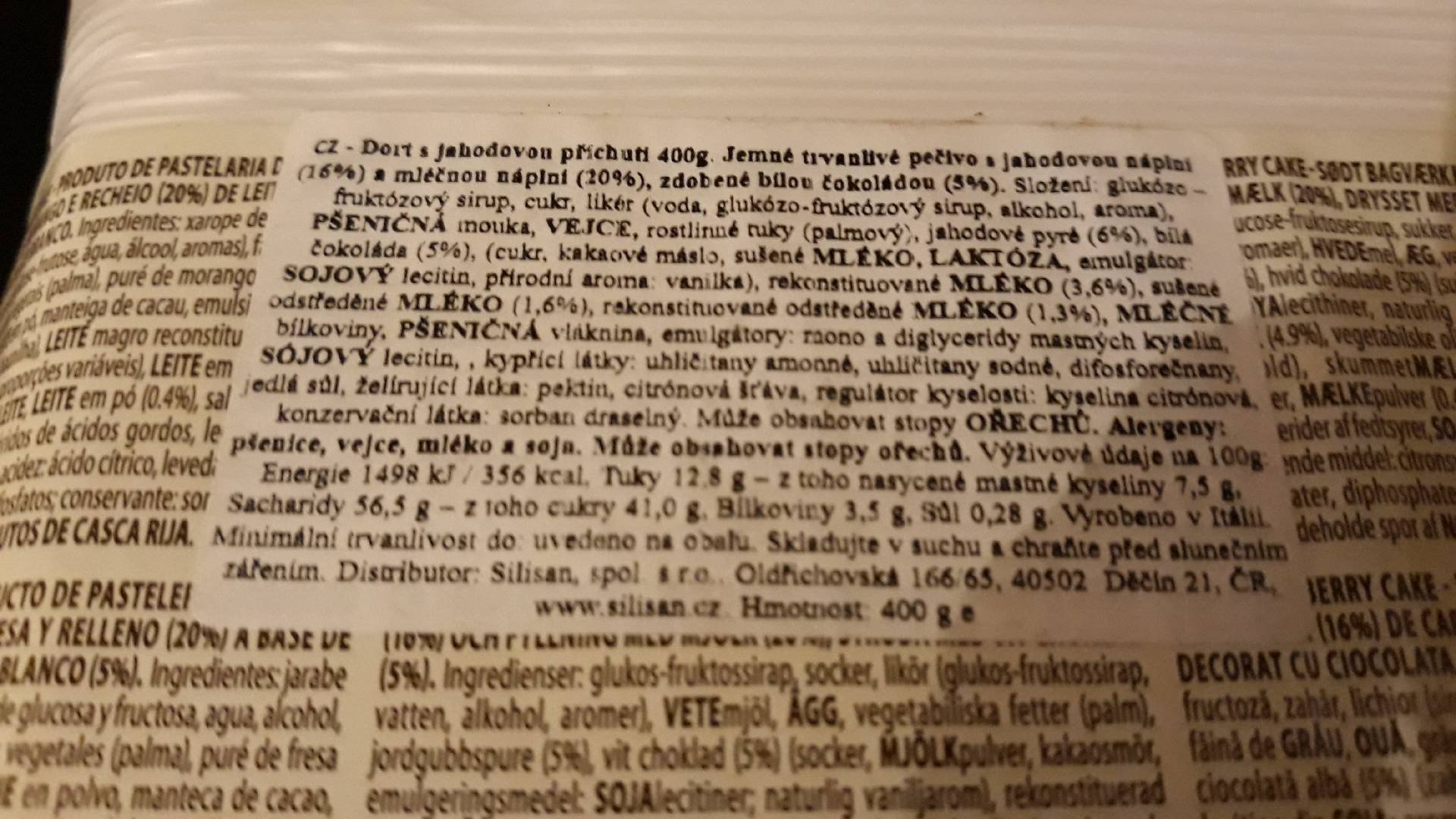 Jemné trvanlivé pečivo s jahodovou náplní (16%) a mléčnou náplní (10%), zdobené bílou čokoládou (5%)