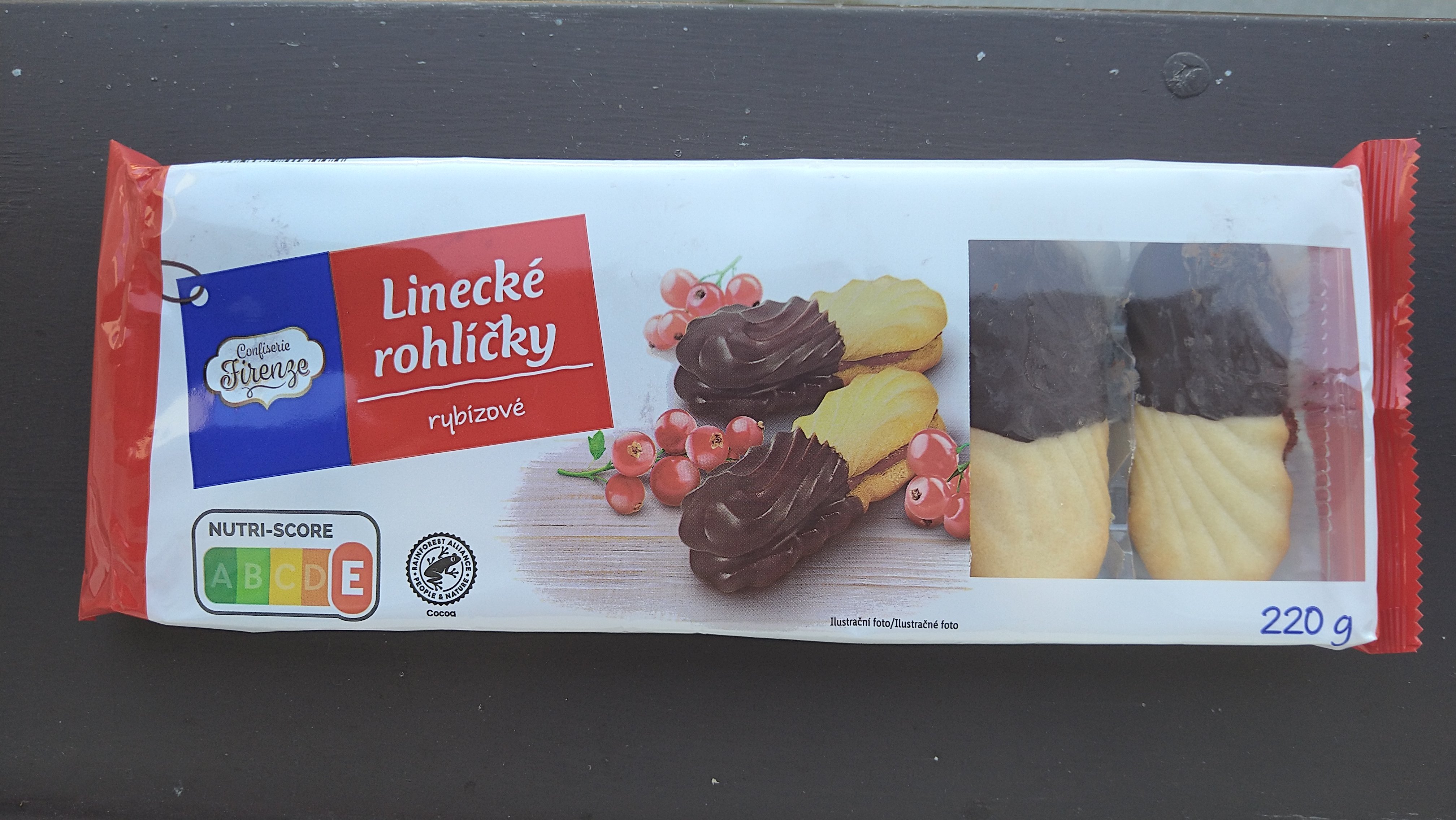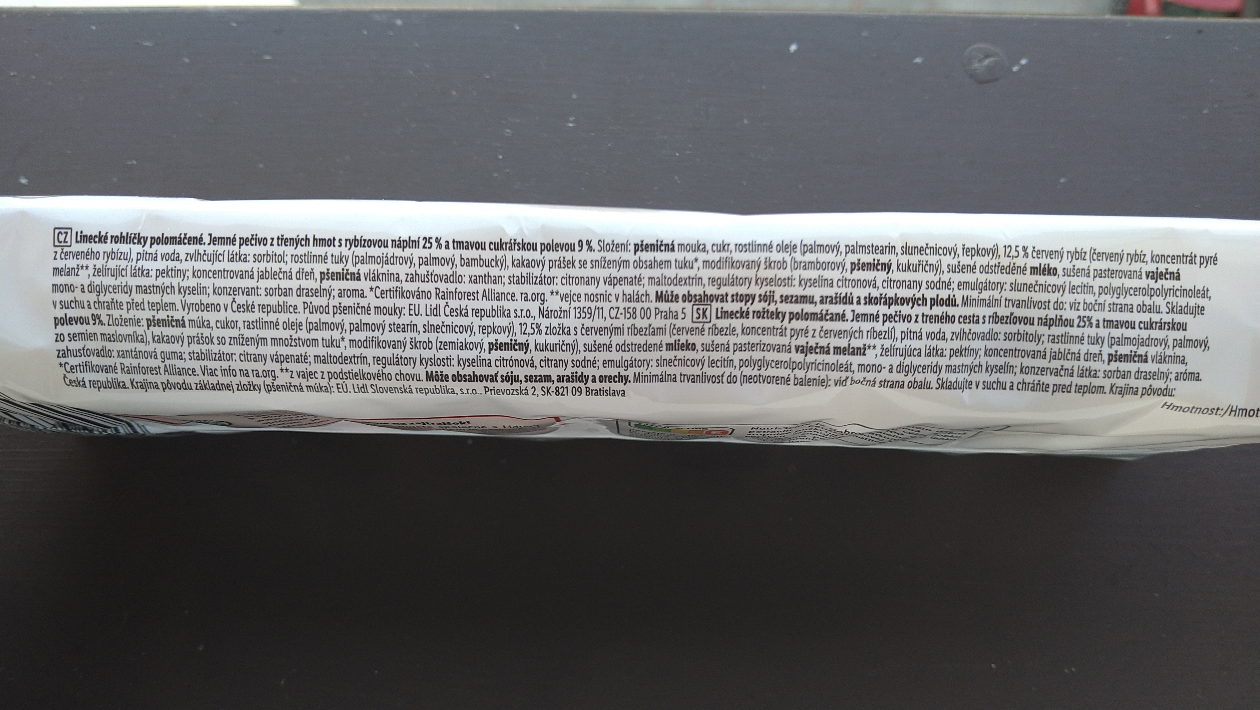 Linecké rohlíčky polomáčené. Jemné pečivo z třených hmot s rybízovou náplní 25 % a tmavou cukrářskou polevou 9 %.