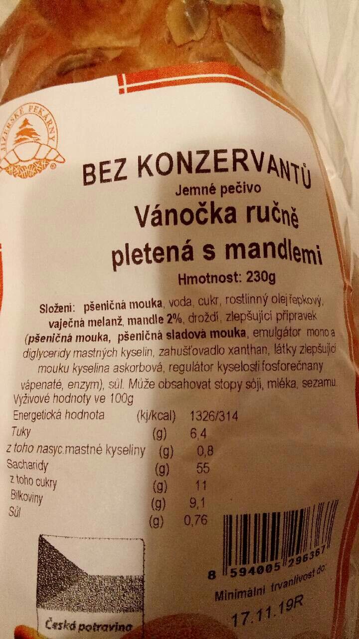Vánočka ručně pletená s mandlemi.