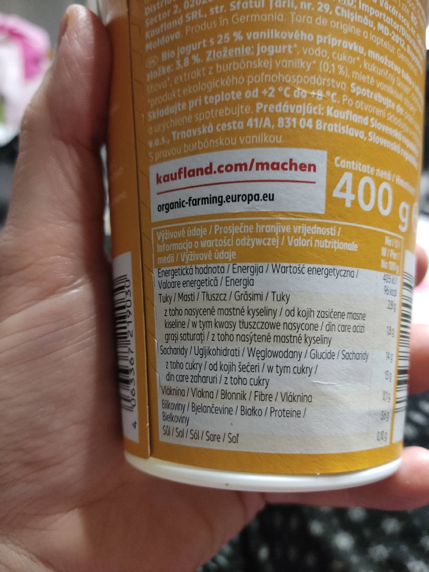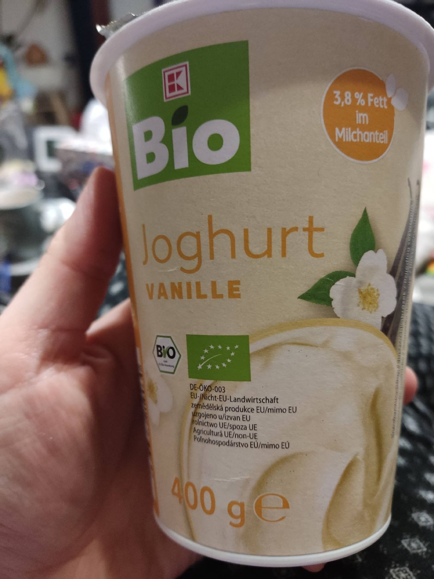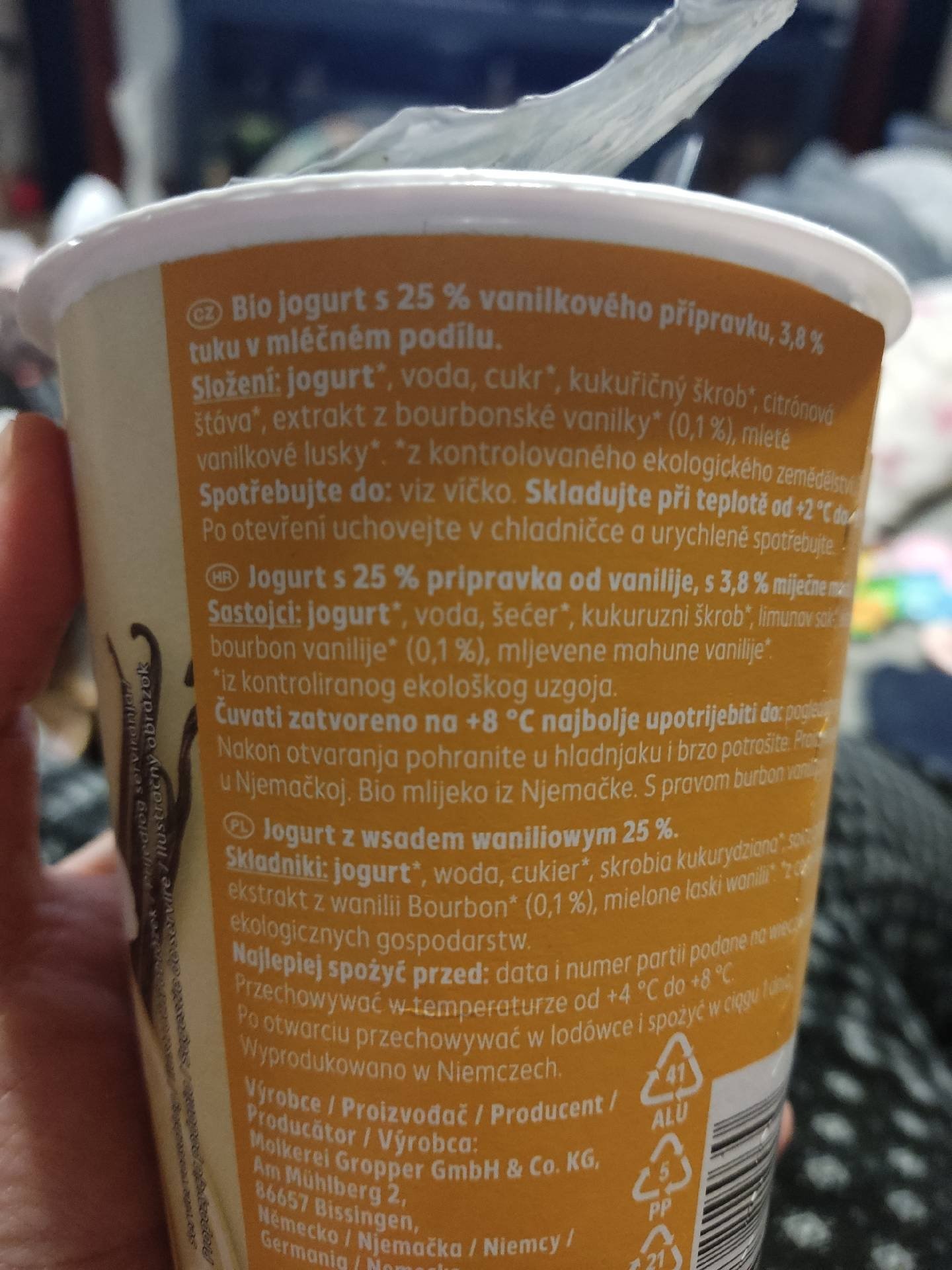 Bio jogurt s 25% vanilkového přípravku, 3,8% tuku v mléčném podílu.