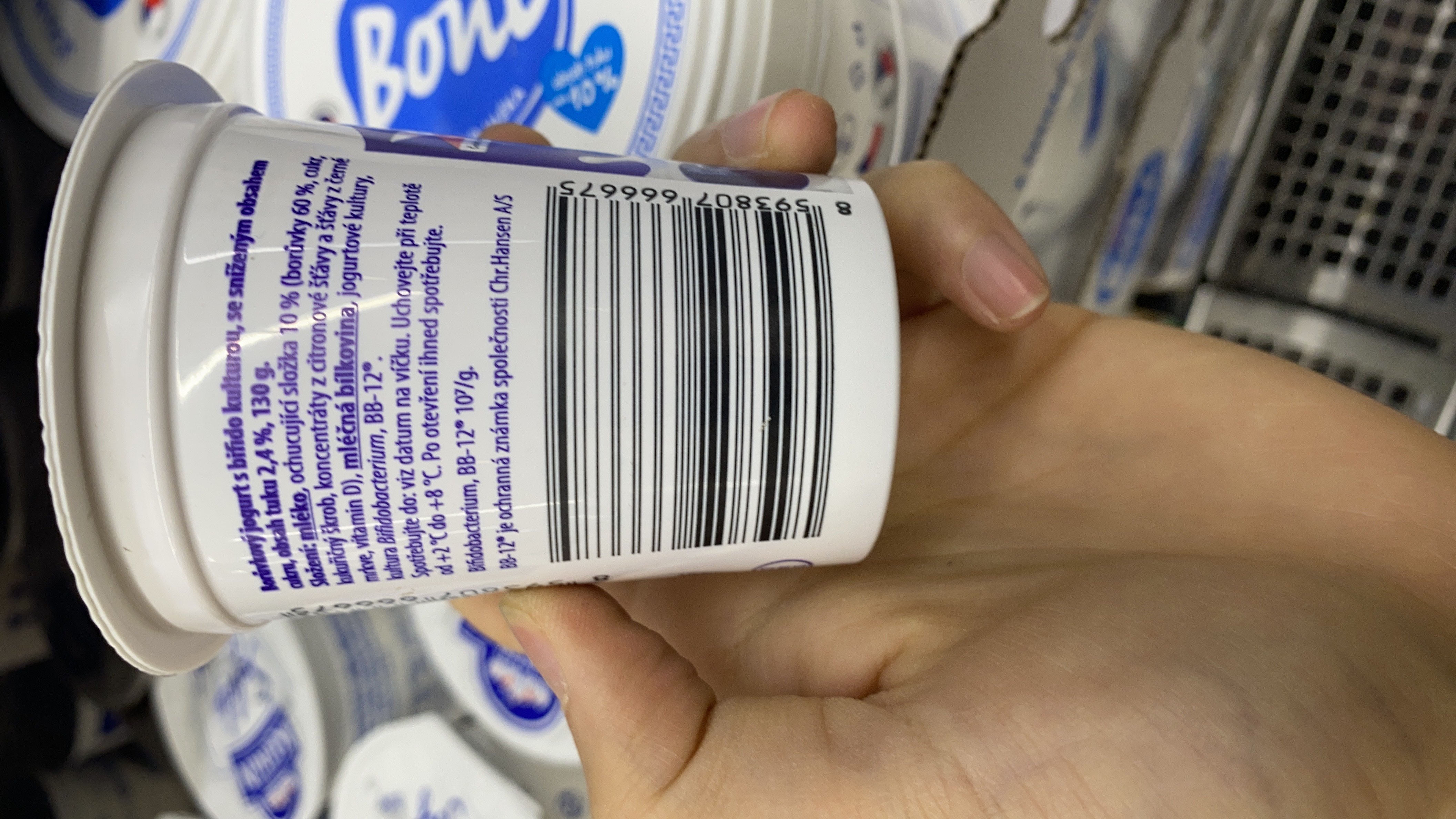 Borůvkový jogurt s bifido kulturou, se sníženým obsahem cukru, obsah tuku 2,4%.