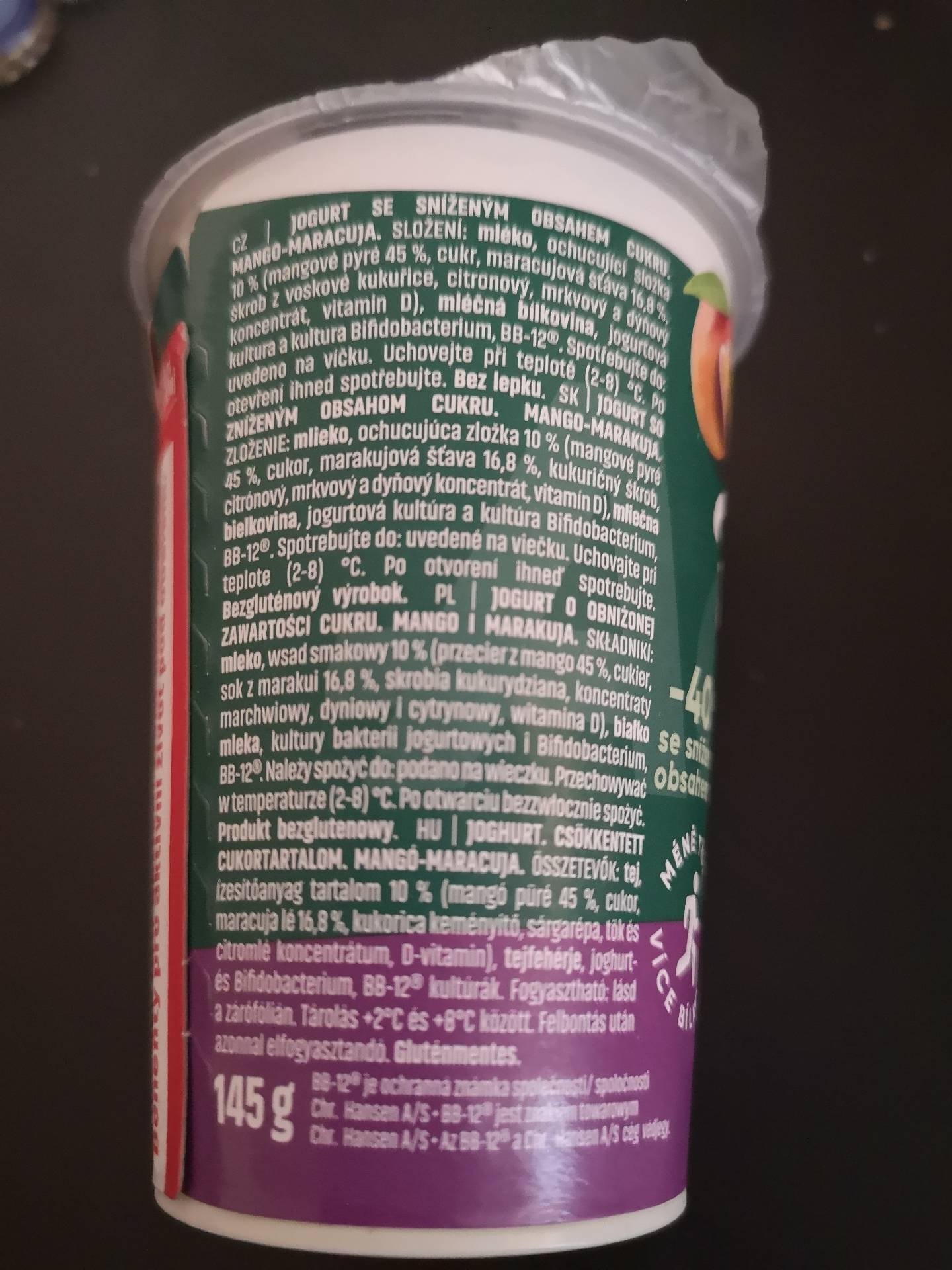 Jogurt se sníženým obsahem cukru mango-maracuja.
