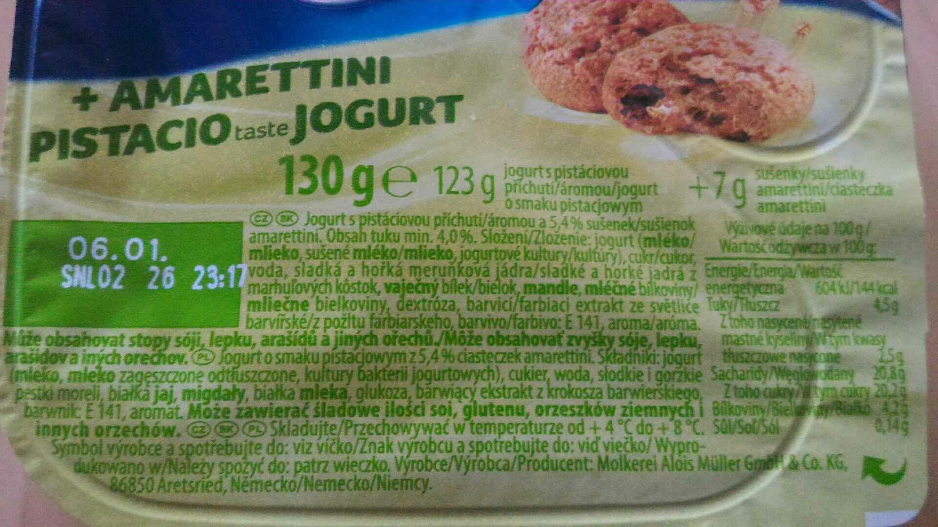Jogurt s pistáciovou příchutí a 5,4% sušenek amarettini.