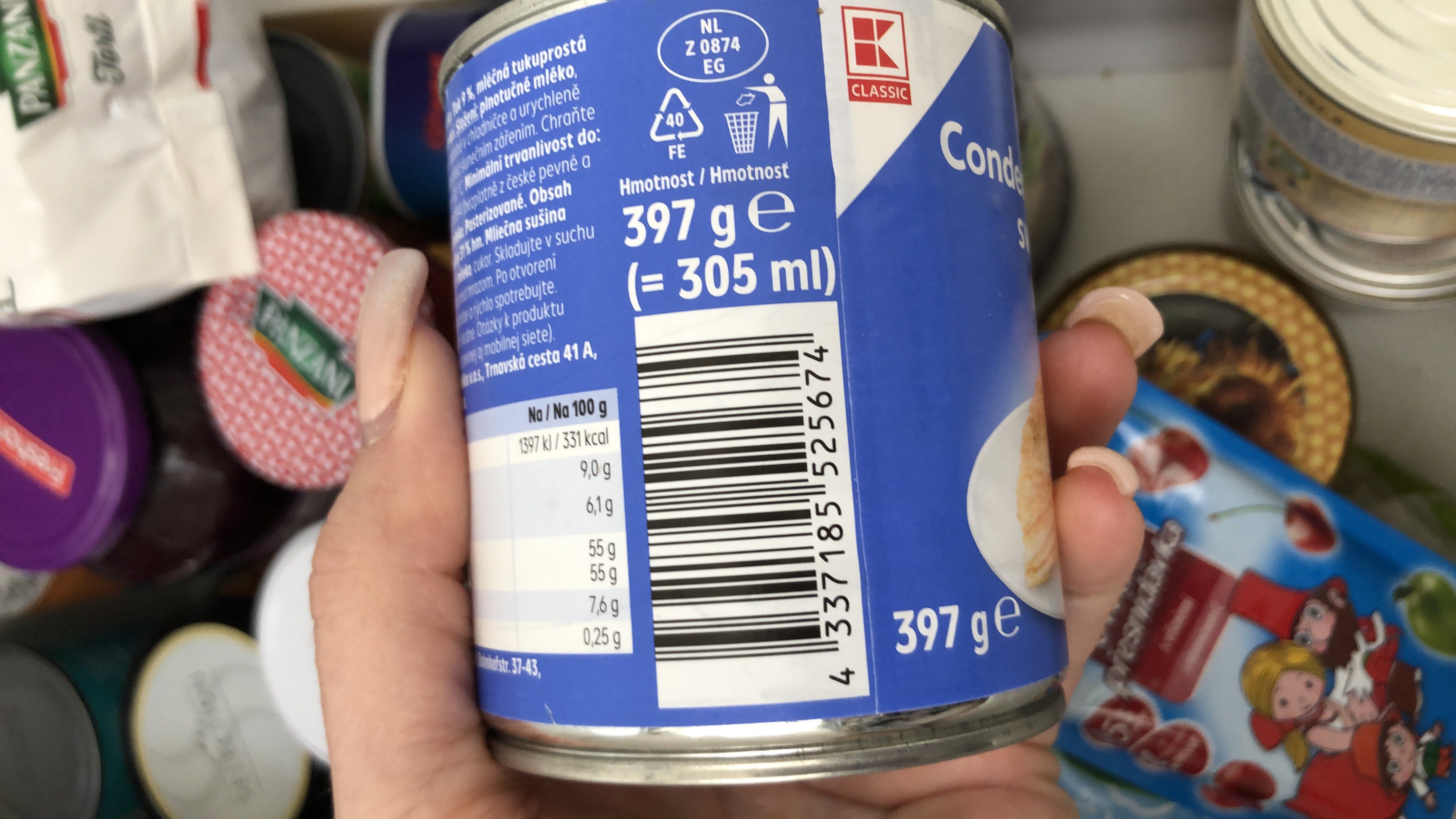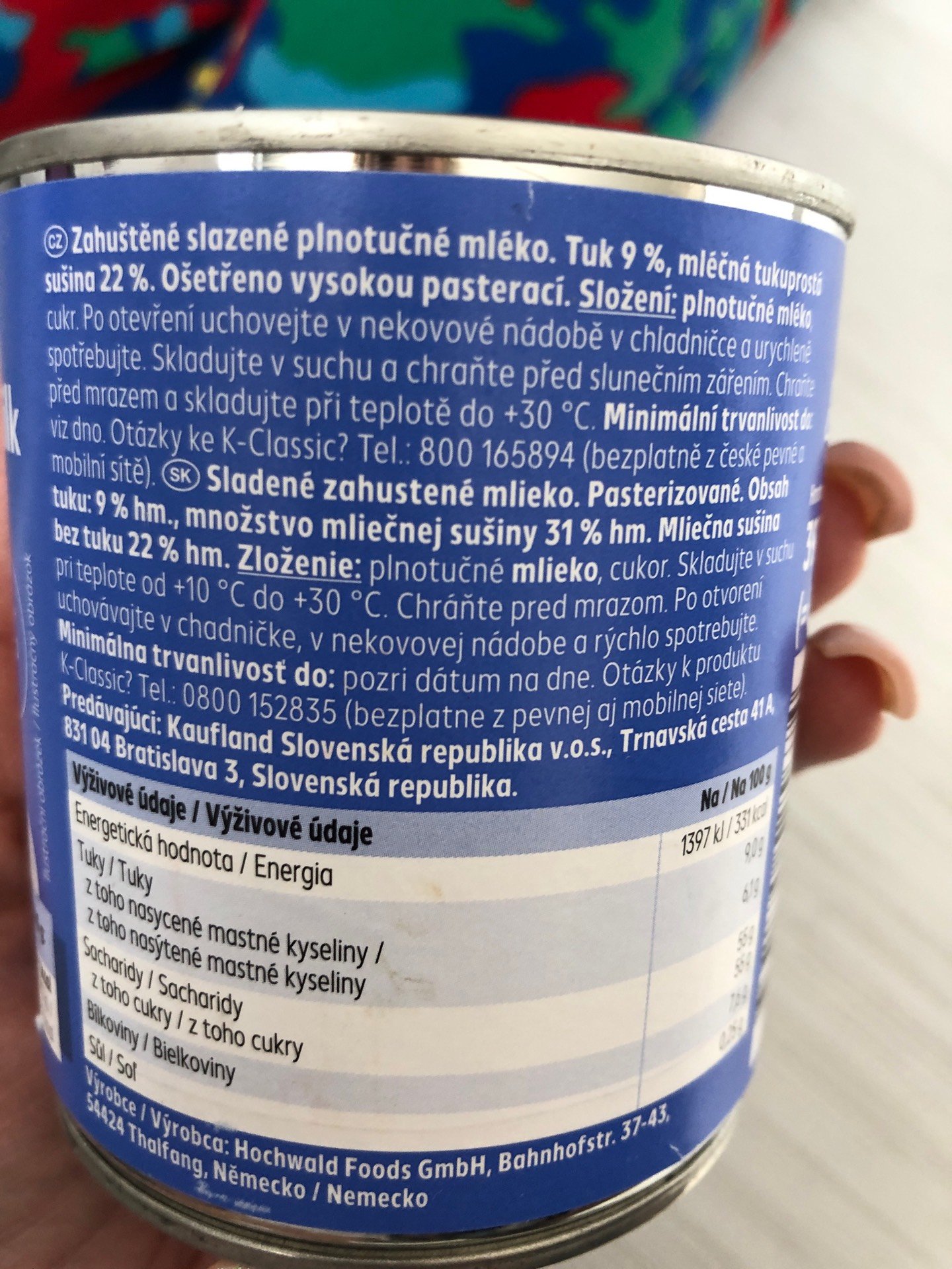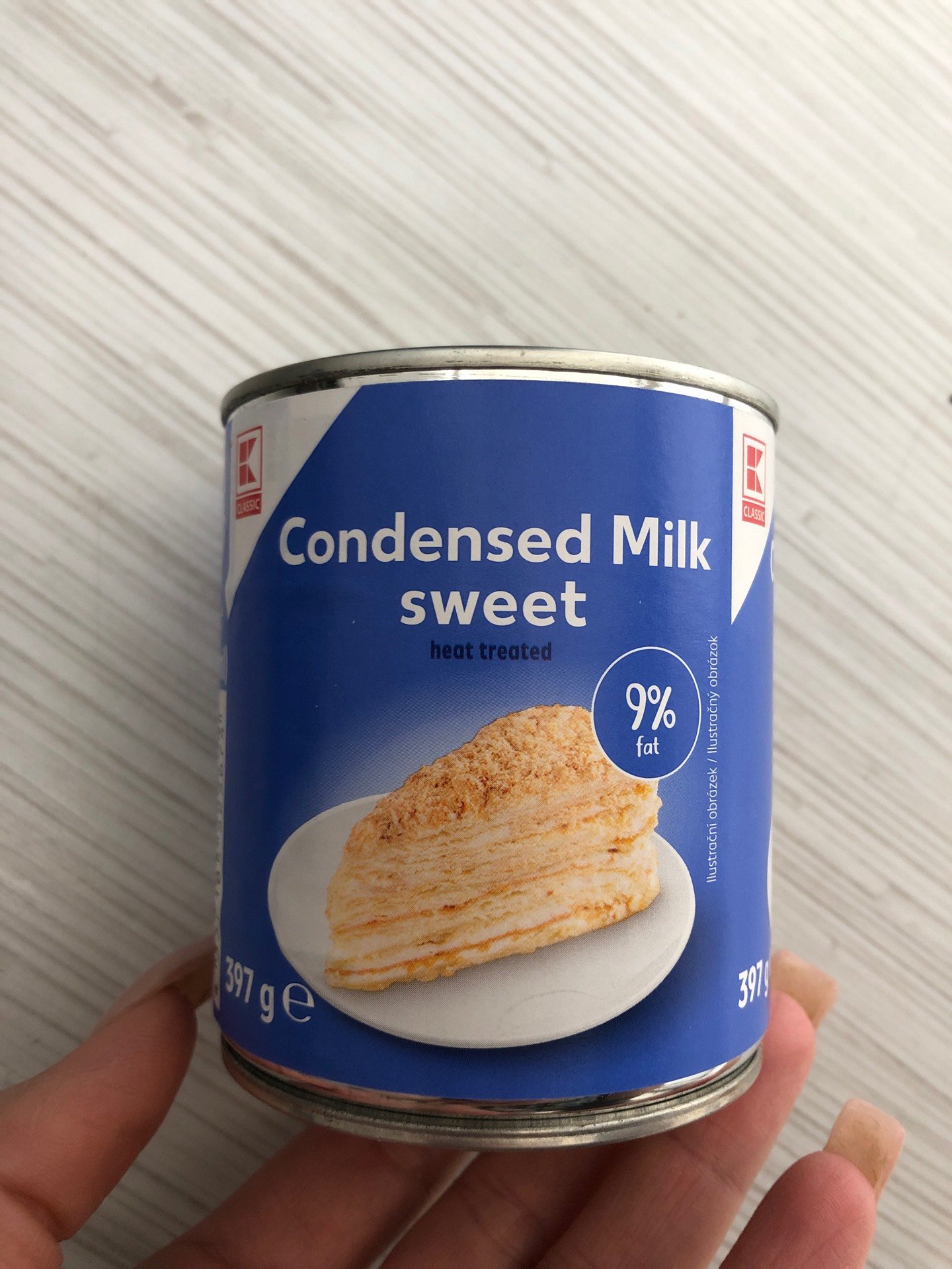 Zahuštěné slazené plnotučné mléko.