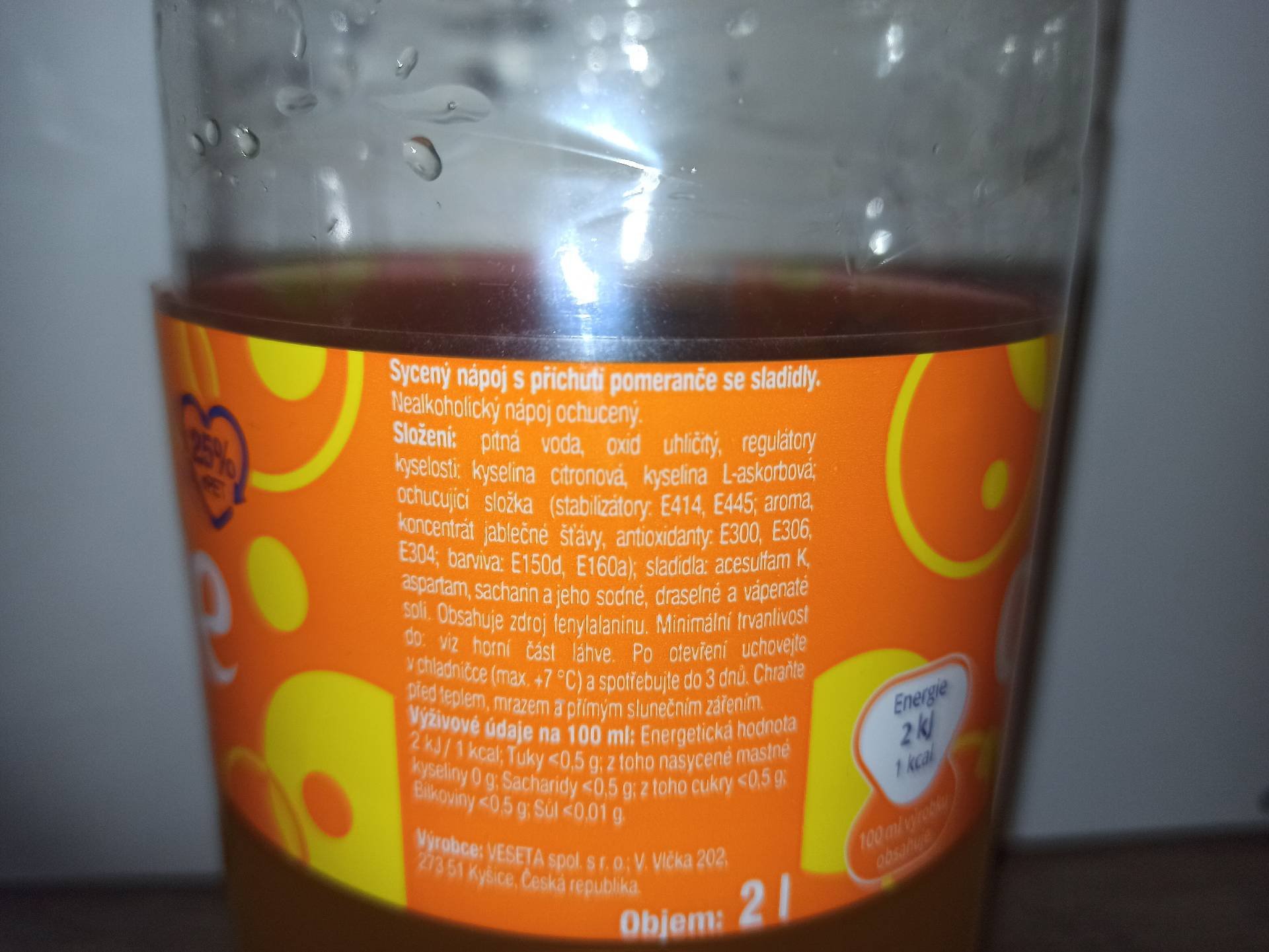 Sycený nápoj s příchutí pomeranče se sladidly. Nealkoholickcý nápoj ochucený