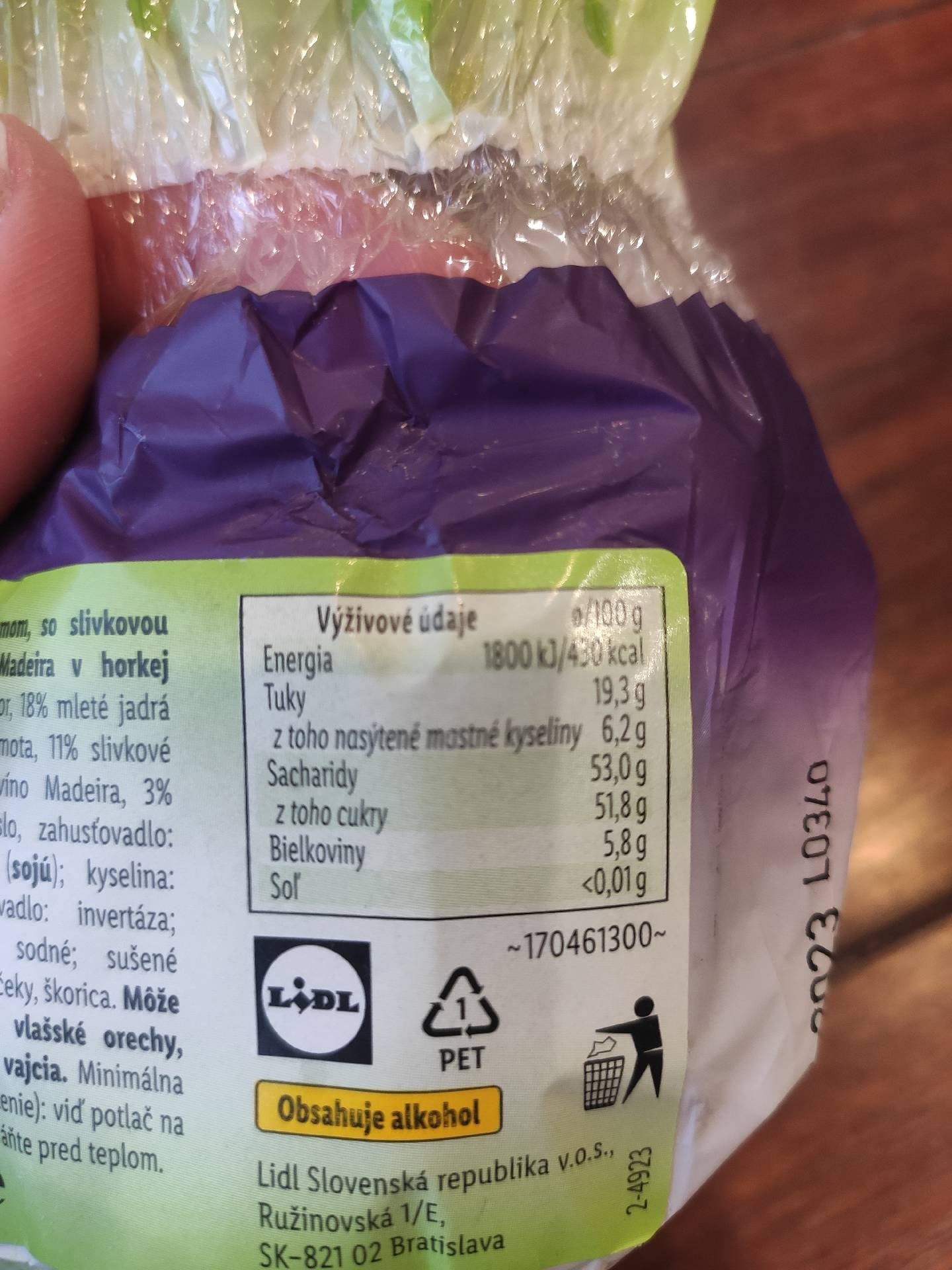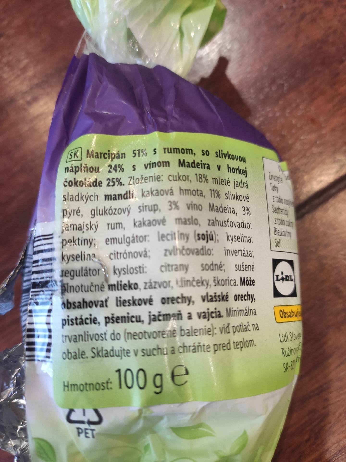 Marcipán 51% s rumem, se švestkovou náplní 24% s vínem Madeira v hořké čokoládě 25%.