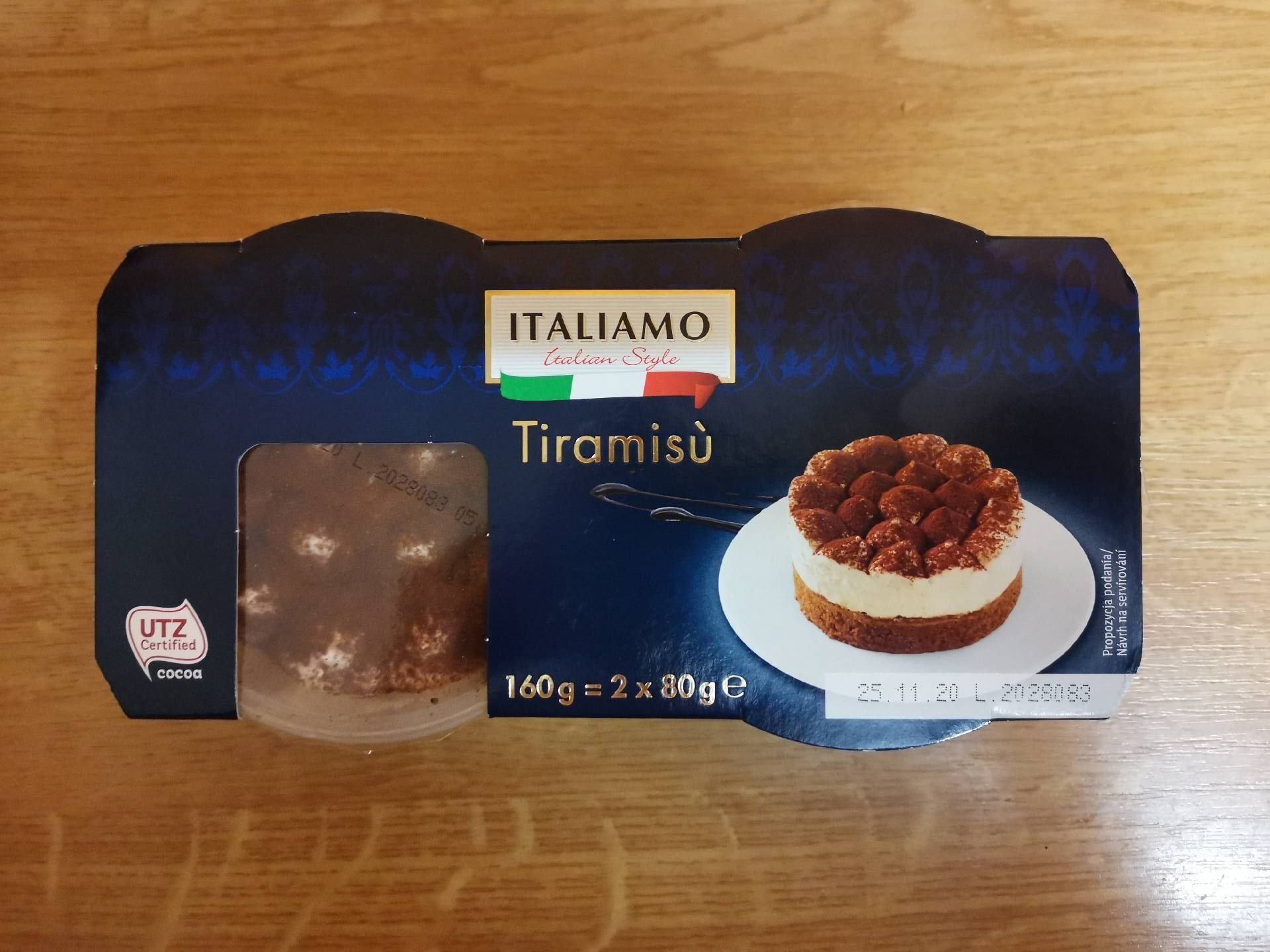 Dezert z mascarpone na korpusu máčeném v kávě, s kakaovým posypem.