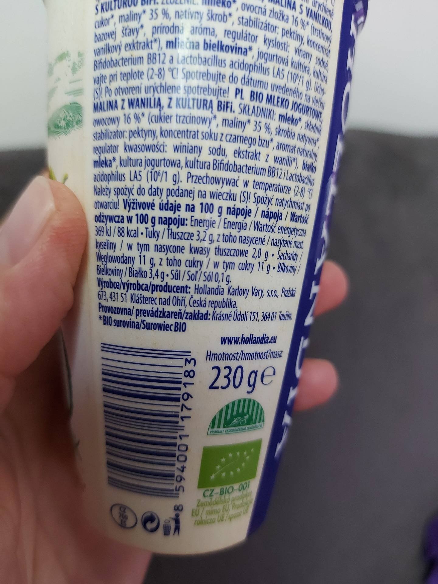 Bio jogurtové mléko, malina s vanilkou, s kulturou BiFi.